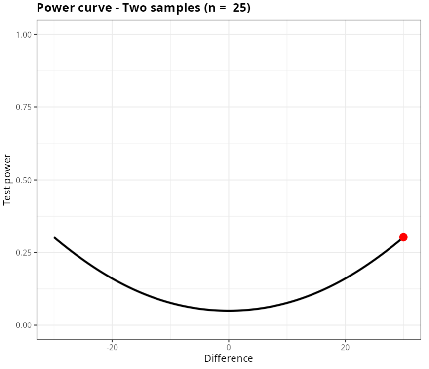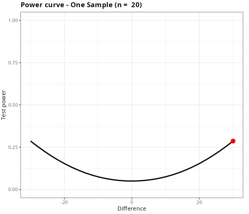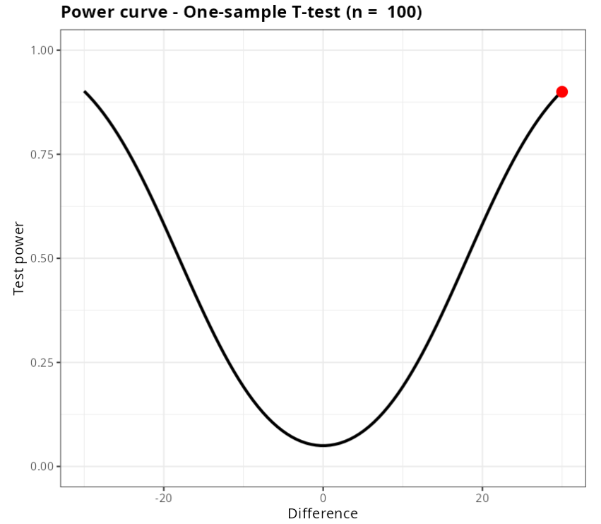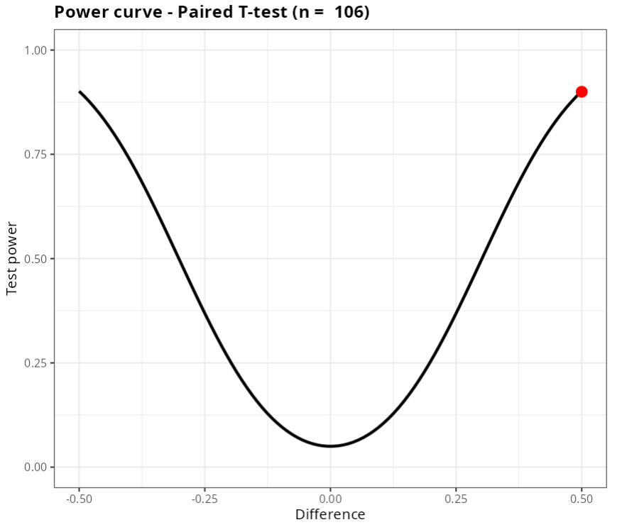 Therefore, for the test to detect a difference of 0.5 in the hypothesis test with a power of at least 0.9, a sample size of at minimum n = 106 is required.