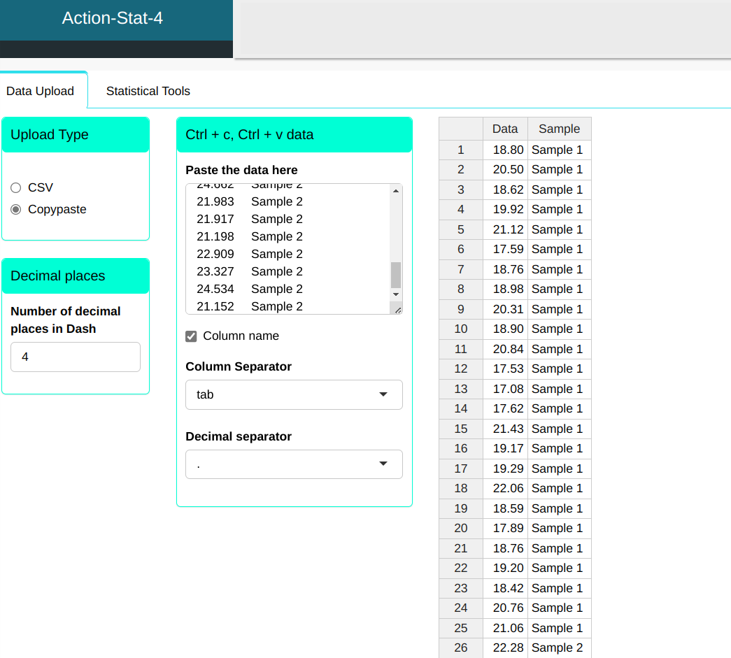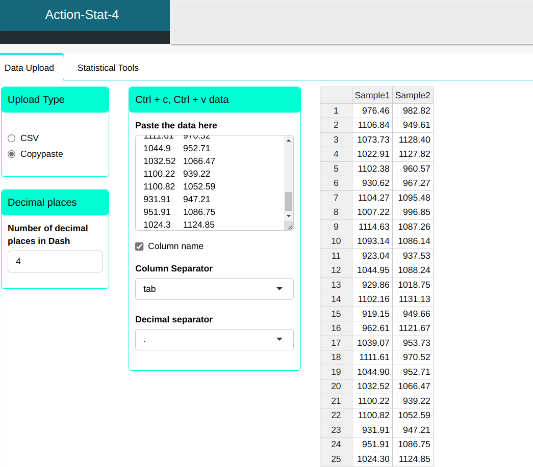 First, we need to calculate the standard deviation. Using Action Descriptive Summary tool, we get the values $s_1 =$ 1.36228 e $s_2 =$ 1.43822