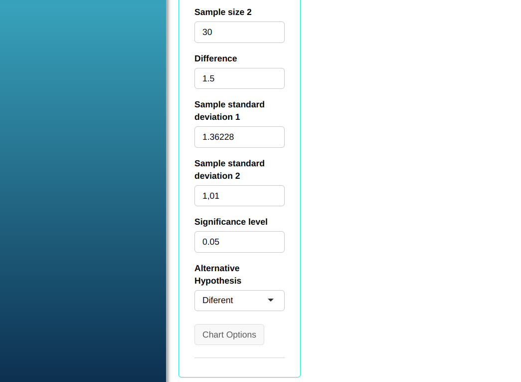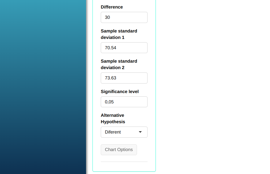 Let us calculate the power of the T-test, with two samples of the same size, to detect a difference $\mu_1$ -$\mu_2$ = 30. First, we need to calculate the standard deviation. Using Action Descriptive Summary tool, we obtain the following values $s_1$ = 70.54 e $s_2$ = 73.63