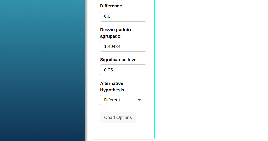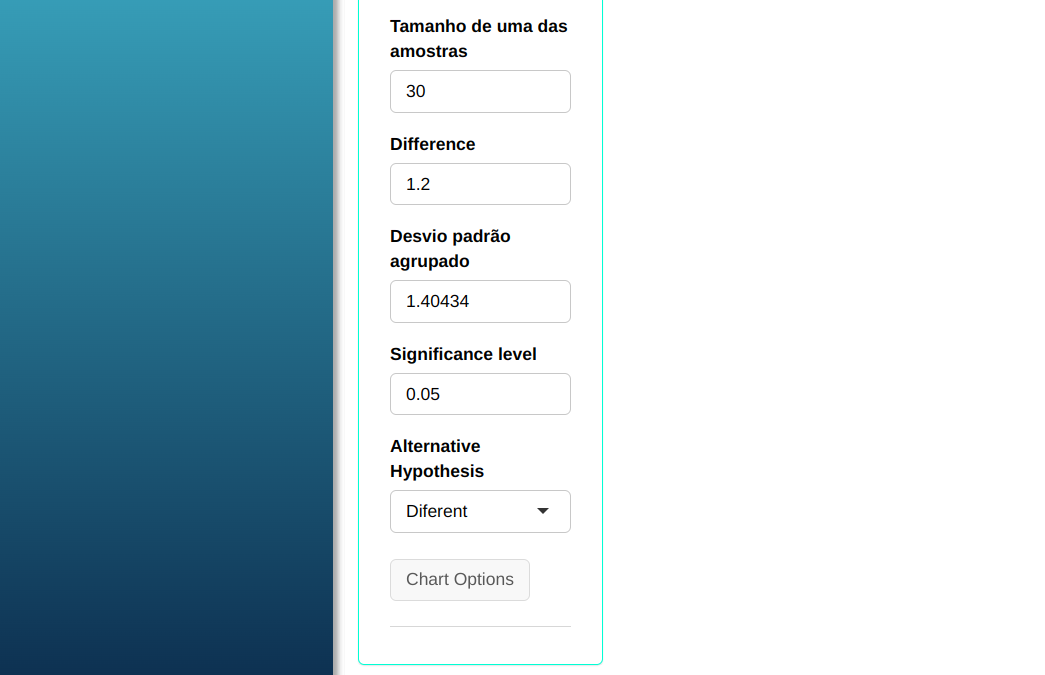 | $\mathbf{n_1}$ | $\mathbf{n_2}$ | $\mathbf{\alpha}$ | Diferença $\mathbf{(\mu_1 - \mu_2)}$ | Desvio-Padrão 1 | Desvio-Padrão 2 |