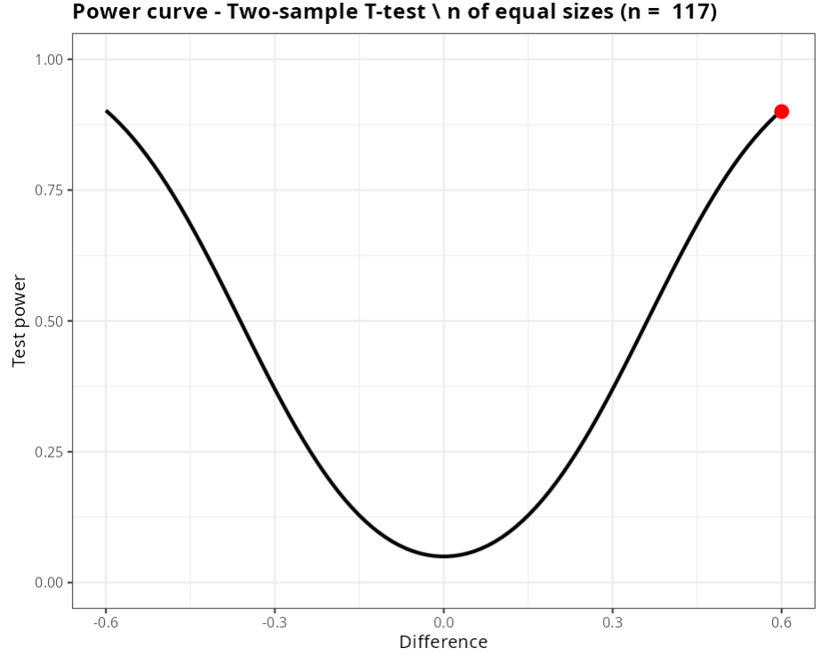We conclude that, to detect a difference of 0.6 with a power of minimum 0.9, the two samples must have 117 elements.