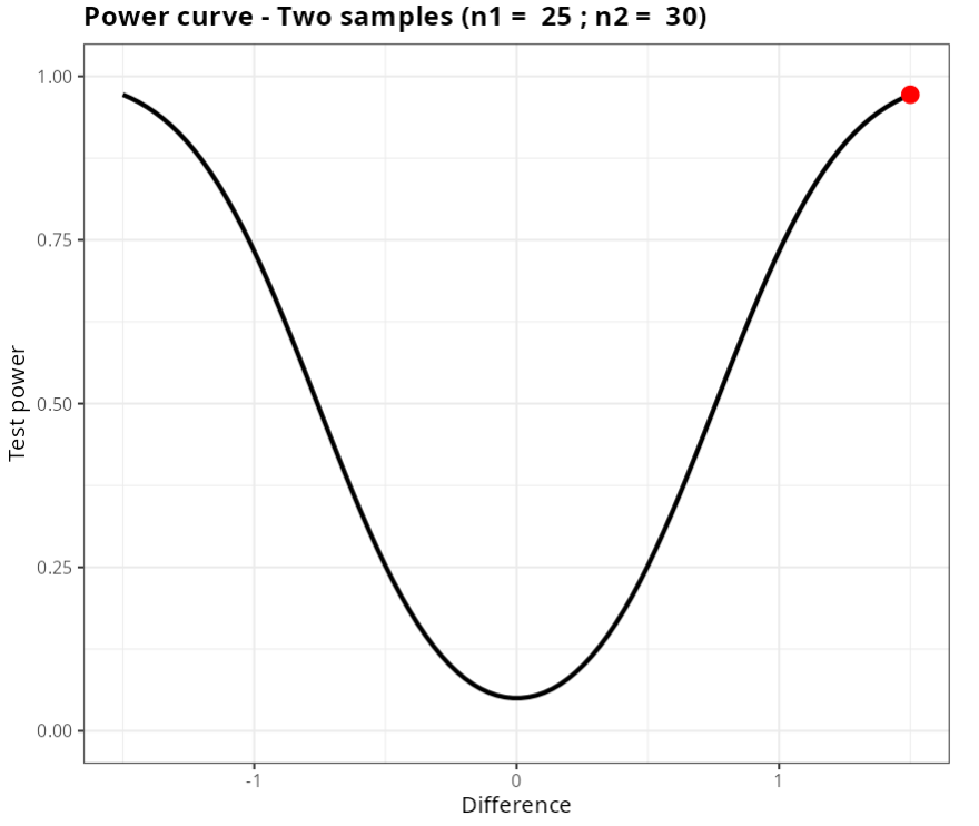Let us calculate the power of the two-sample T-test to detect a difference μ1 - μ2 = 1,5.
