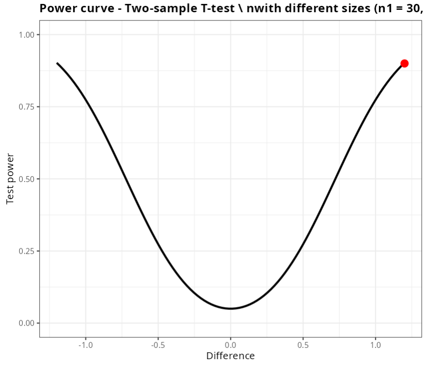 Using the previous example, suppose that with a sample size of 30, pooled standard deviation 1.40434, we want to calculate the size of the other sample needed for the T-test to find a difference of 1.2, with a power of at minimum 90%.