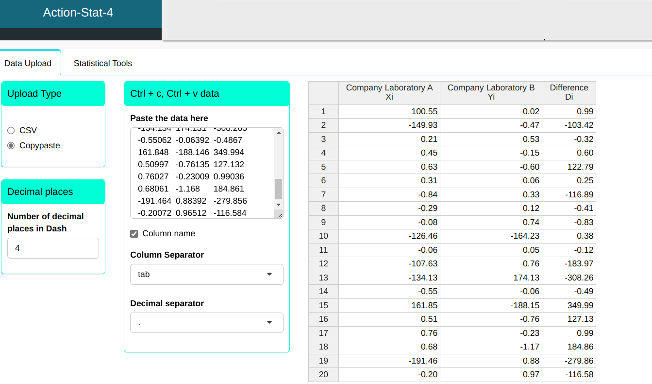 where $\mu_D$ will be estimated by the sample mean of the differences, i.e. D. Using Action Basic Statistics tool, we find that the sample mean is D = -0.110499 and the sample standard deviation is S = 1.56907778.
