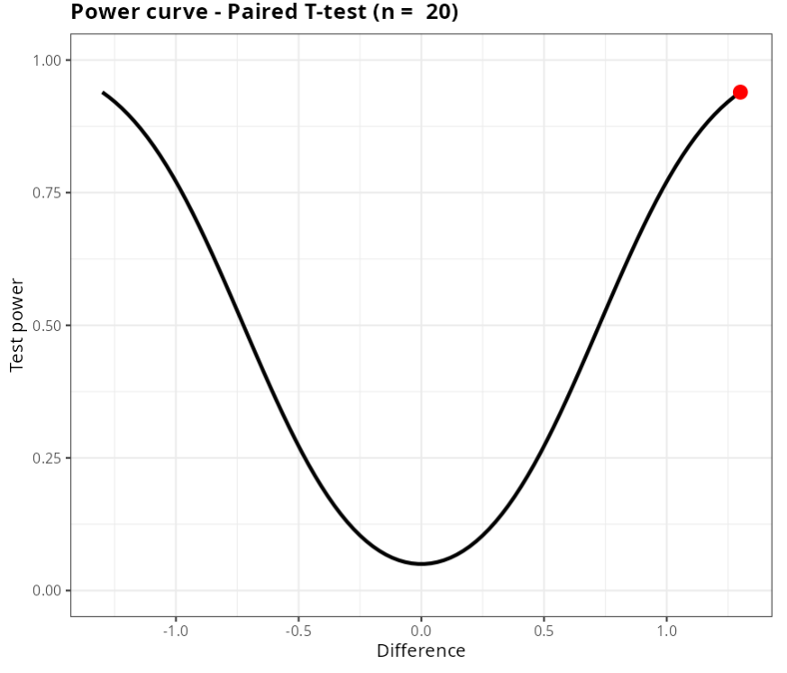 Using the previous example, now suppose we want to calculate the sample size needed for the Paired T-test to detect a difference of 0.5 with a power of at least 90%