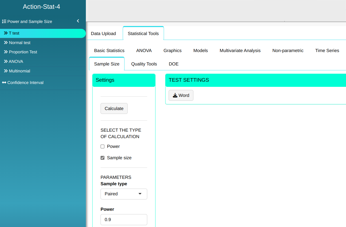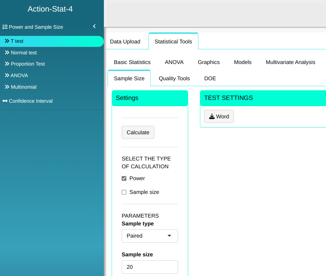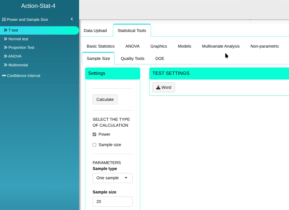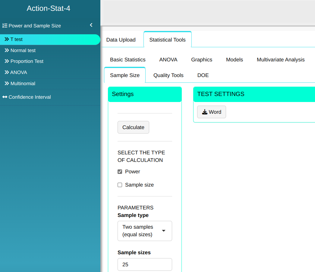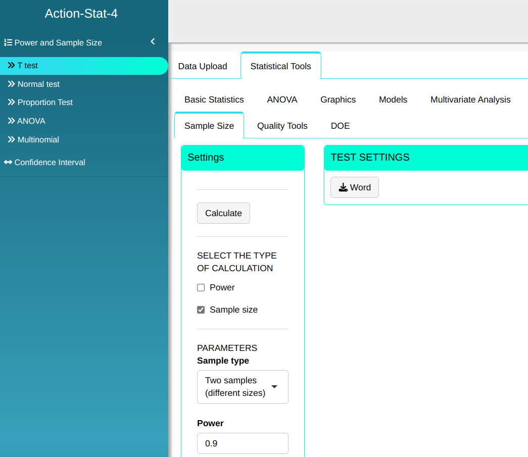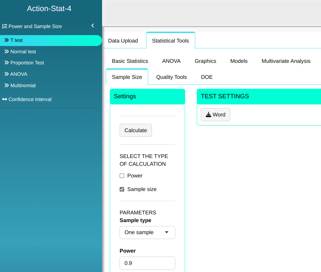 Here the T-Test is used to calculate the power of the hypothesis test or the sample size.
