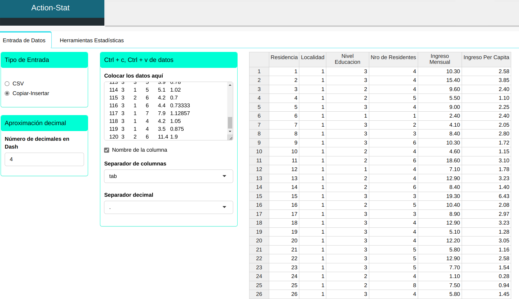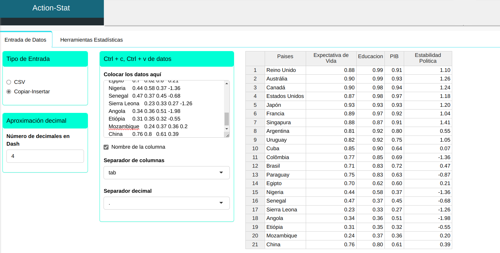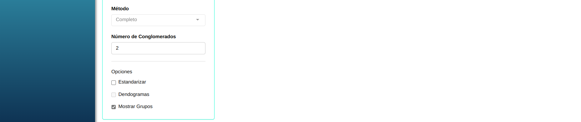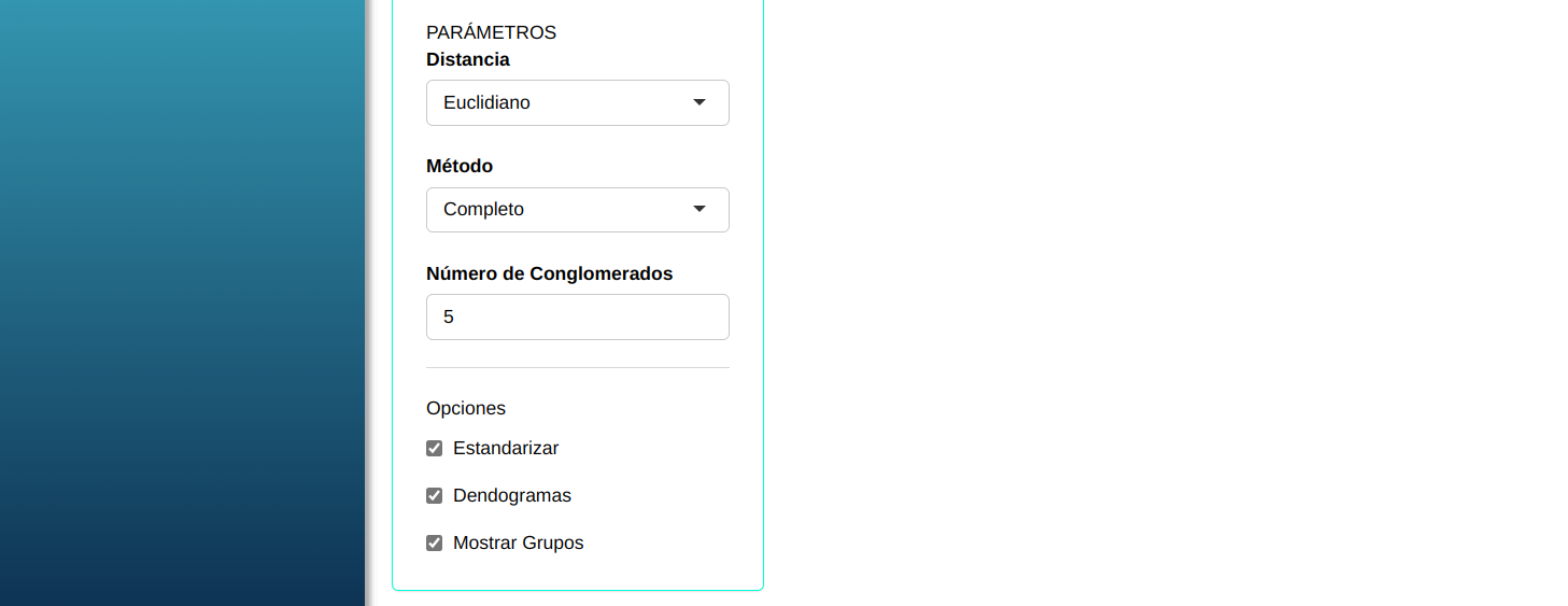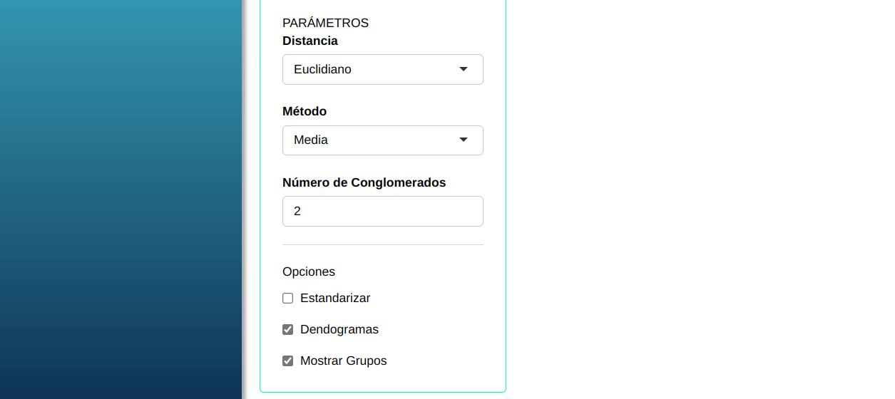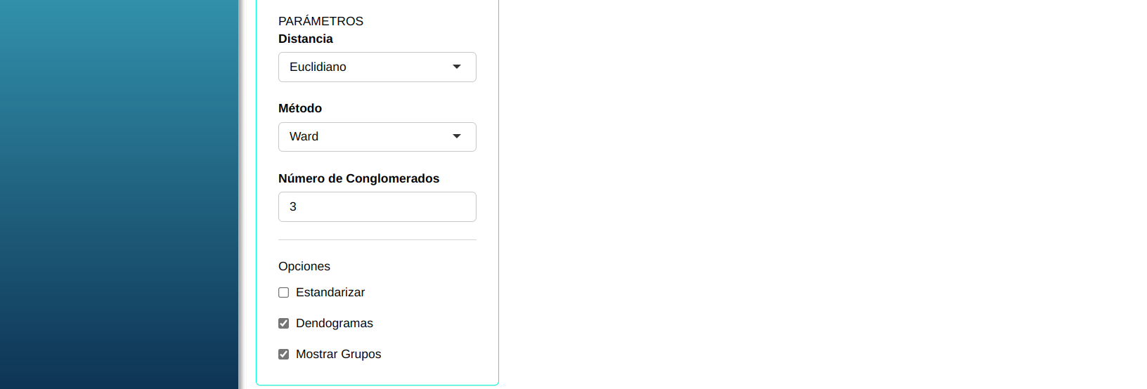 Para el método jerárquico, es posible elegir los parámetros de distancia (Euclidiana, Manhattan o Gower) y el método (ward, single, complete, average, median o centroide). Hay opciones para estandarizar los datos, mostrar los datos en un dendrograma y mostrar grupos.