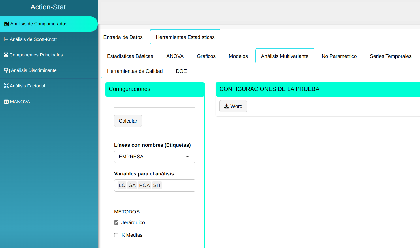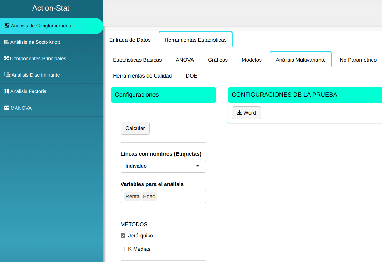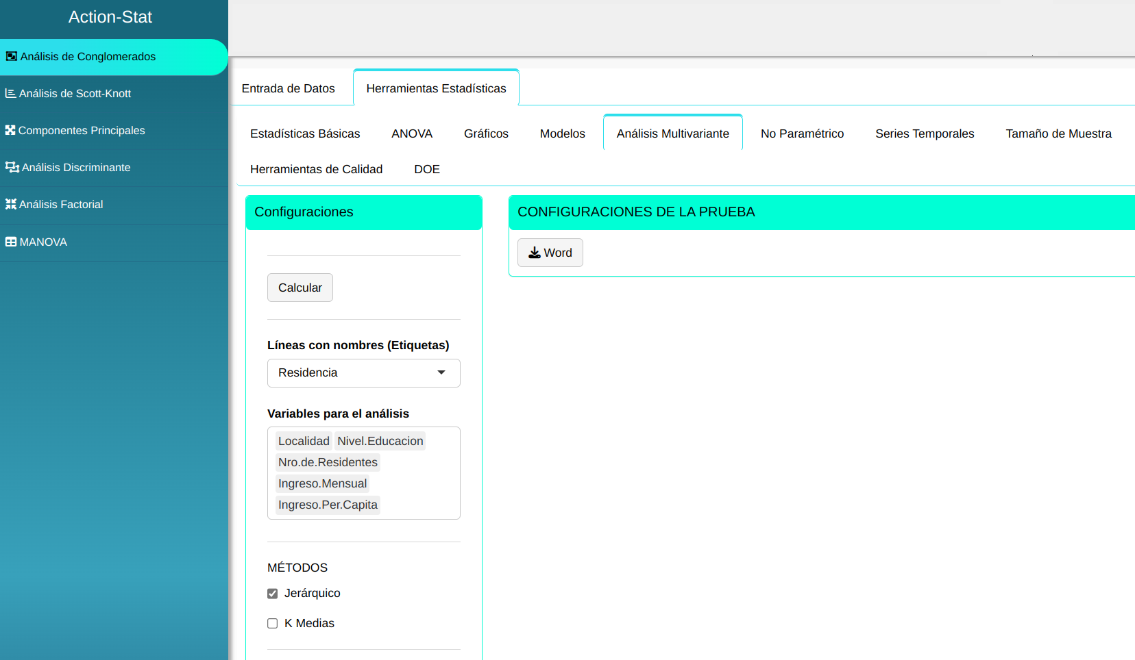 Para el método jerárquico, es posible elegir los parámetros de distancia (Euclidiana, Manhattan o Gower) y el método (ward, single, complete, average, median o centroide). Hay opciones para estandarizar los datos, mostrar los datos en un dendrograma y mostrar grupos.