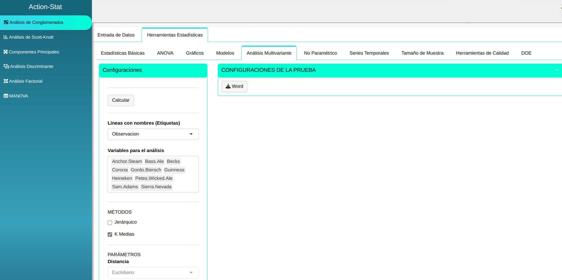 Una cervecería quiere estudiar los gustos de sus clientes en relación a algunas marcas de cerveza. El siguiente cuadro representa los resultados de un estudio de las percepciones y preferencias. Cada estudiante calificó las 10 marcas de cerveza en una escala de 10 puntos: Anchor Steam, Bass Ale, Beck's, Corona, Gordo-Biersch, Guinness, Heineken, Pete's Wicked Ale, Sam Adams y Sierra Nevada. Aplicaremos Análisis de Cluster utilizando el método K-means para comparar grupos.