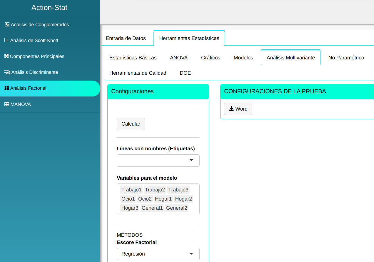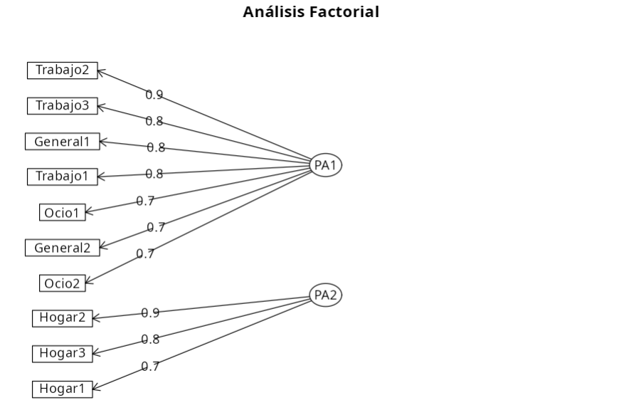 Se realizó un estudio para evaluar la satisfacción vital. Se administró un cuestionario a una muestra aleatoria de 100 adultos. El cuestionario contiene 10 preguntas para medir la satisfacción en el trabajo (TRABAJO_1, TRABAJO_2, TRABAJO_3), la satisfacción con el ocio (OCIO_1, OCIO_2), la satisfacción en el hogar (HOGAR_1, HOGAR_2, HOGAR_3) y la satisfacción general en otros ámbitos de la vida (GENERAL_1, GENERAL_2). El objetivo del estudio es comprender la relación entre las distintas esferas de satisfacción. Utilizaremos el Análisis Factorial mediante el Método de Regresión por Puntuación Factorial y el Método de Soluciones Factoriales por Factores Principales. Además, utilizaremos la Rotación Ortogonal por Factores de Varianza Máxima (Varimax).