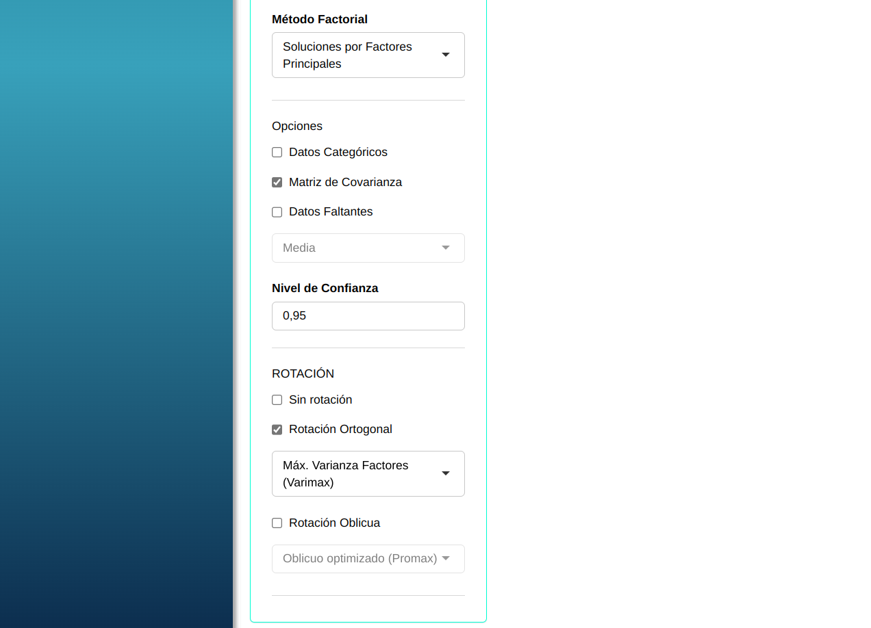El modelo de Análisis Factorial tiene como objetivo describir la variabilidad de variables correlacionadas observadas en un número menor de variables no observadas (linealmente relacionado con las variables originales), llamados factores comunes o variables latentes.