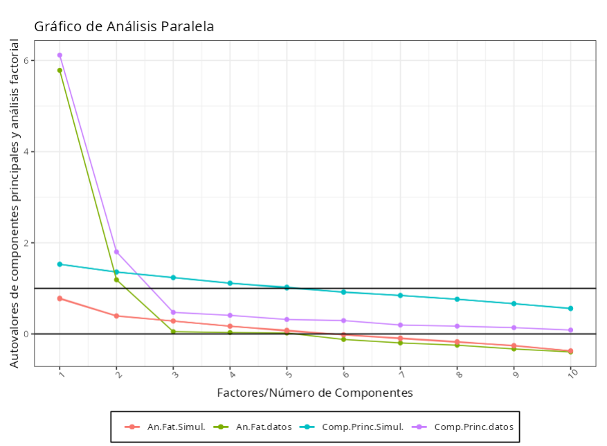 | Datos del Análisis Factorial | Datos simulados del Análisis Factorial | Datos de los Componentes Principales | Dados simulados de los Componentes Principales | Unicidad | Comunalidad | Cargas | |
