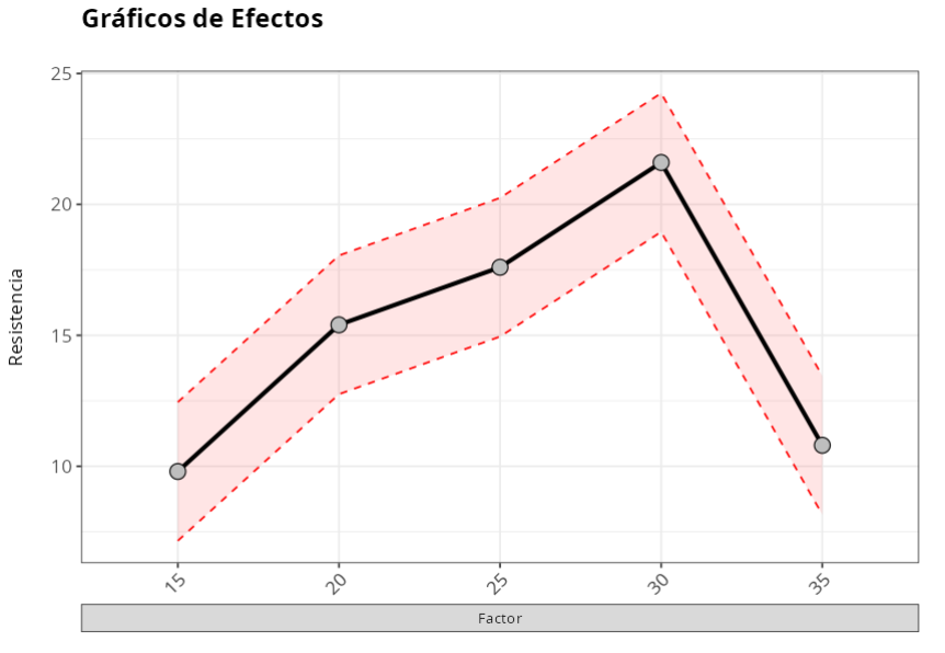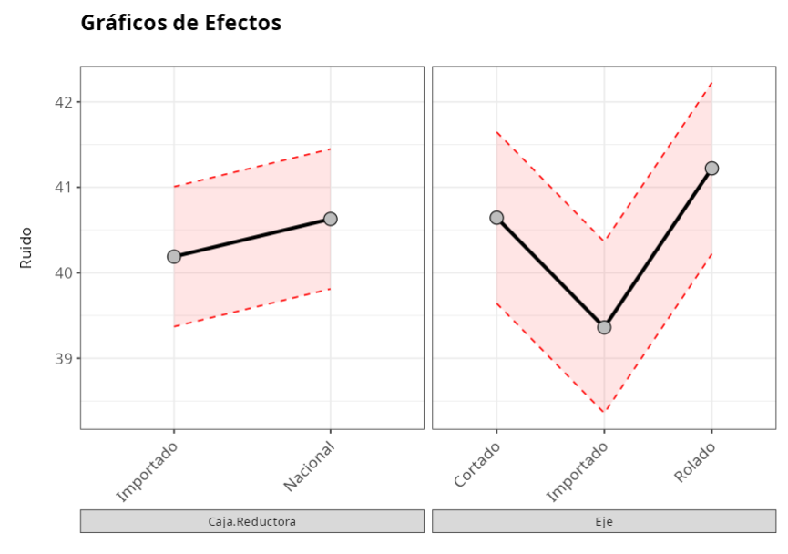 En el gráfico, los puntos negros son las medias de cada nivel de factor, que en la tabla se denominan Efectos. Las líneas rojas representan el intervalo de confianza de las medias de los niveles de los factores.