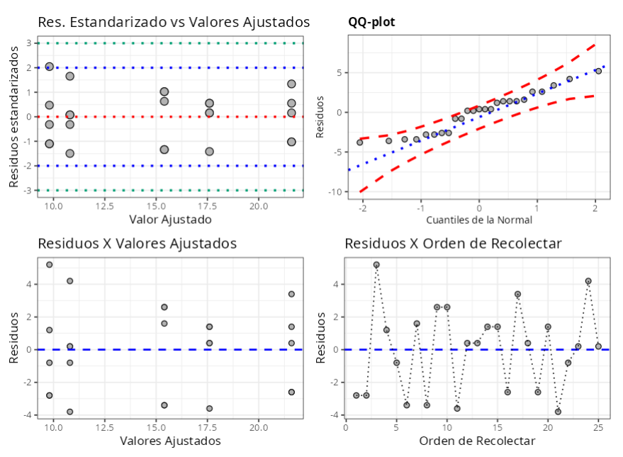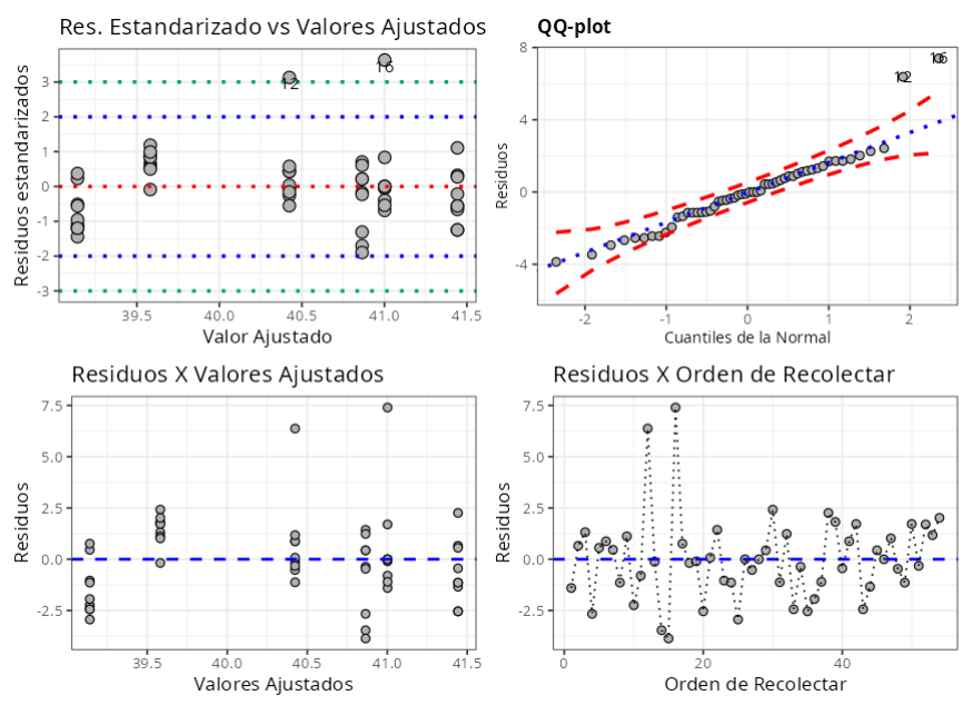 El Gráfico 4: Gráfico de Residuales versus a Orden de colecta, utilizando este gráfico para comprobar si los residuales son independientes. El criterio para el análisis es: si los puntos del gráfico se distribuyen aleatoriamente, esto indica independencia, por otro lado si muestran un patrón, esto indica dependencia en los residuales. En nuestro caso, es comprobado la independencia de los residuos.