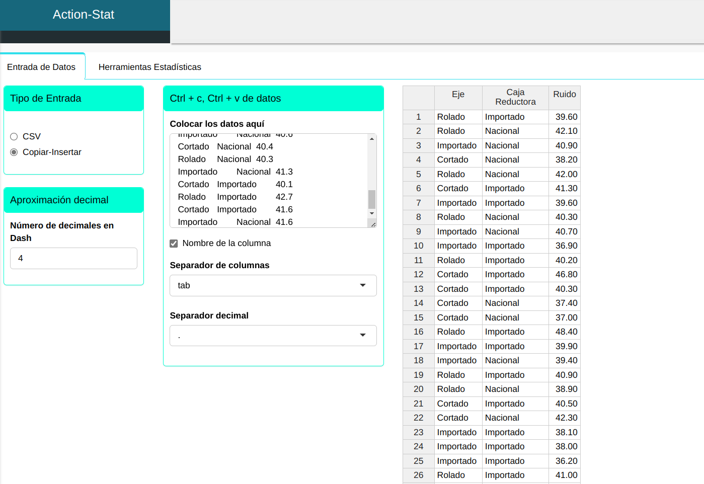 Una empresa que produce limpiaparabrisas para automóviles desea saber cómo los factores Tipo de Caja Reductora y Tipo de Eje, utilizados en la fabricación de los motores que accionan los limpiaparabrisas, influyen en el ruido que se produce cuando se utilizan. Para ello, realizamos un experimento con 54 motores, con 3 tipos de Eje (Laminado, Cortado e Importado) y 2 tipos de Caja Reductora (Nacional e Importada). Para cada motor (unidad experimental) medimos el ruido. Los datos están en la siguiente tabla.