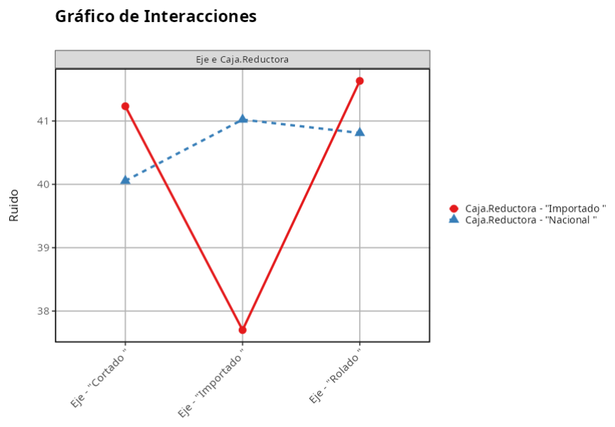 Para evaluar si existe interacción, simplemente debemos comprobar si la gráfica de los factores se cruza, como en la figura. Por tanto concluimos que existe una interacción entre los factores Caja Reductora y Eje.