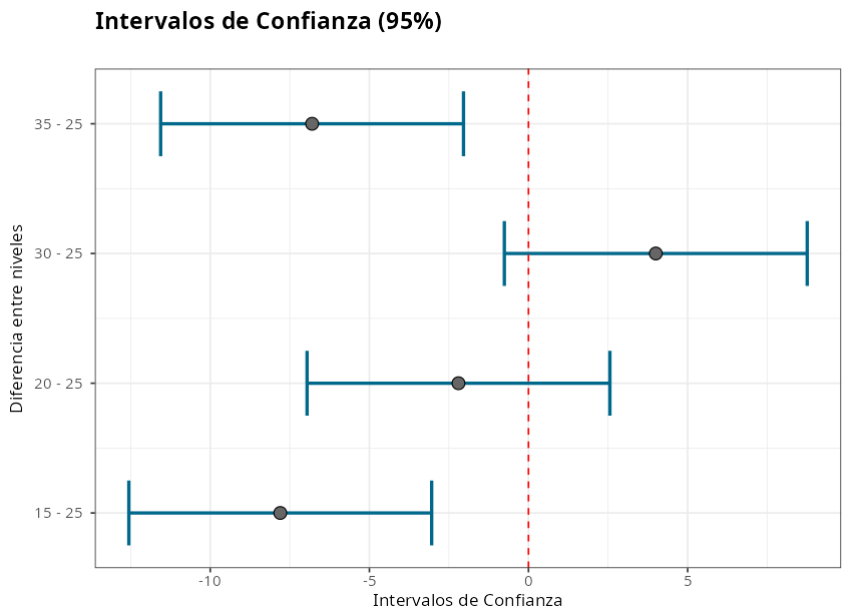 La interpretación de la prueba de Dunnett es similar a la de la prueba de Tukey, es decir, la igualdad entre niveles será rechazada si el valor P es mayor que el alfa o si el intervalo de confianza no contiene el valor "cero". Así, en el ejemplo, rechazamos la hipótesis de igualdad entre los niveles 15 y 25 y entre los niveles 35 y 25. Para otras comparaciones, no se detectó ninguna diferencia significativa.
