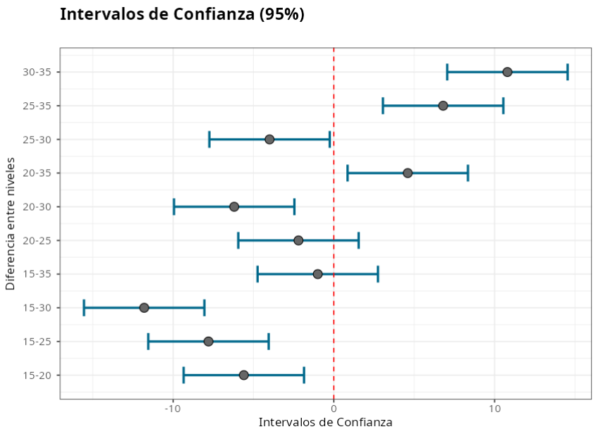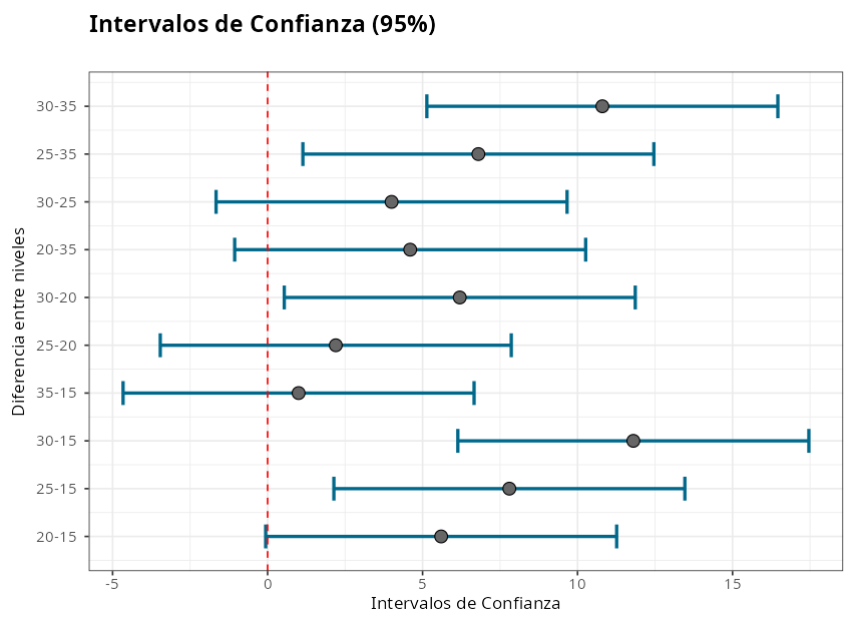 Al igual que las pruebas anteriores, rechazamos la igualdad entre las medias de nivel si el P-valor es menor que alfa o si el intervalo de confianza no contiene el valor "cero". Así, en el ejemplo, rechazamos la hipótesis de igualdad entre niveles para todas las comparaciones, excepto entre los niveles 15-35 y 20-25.
