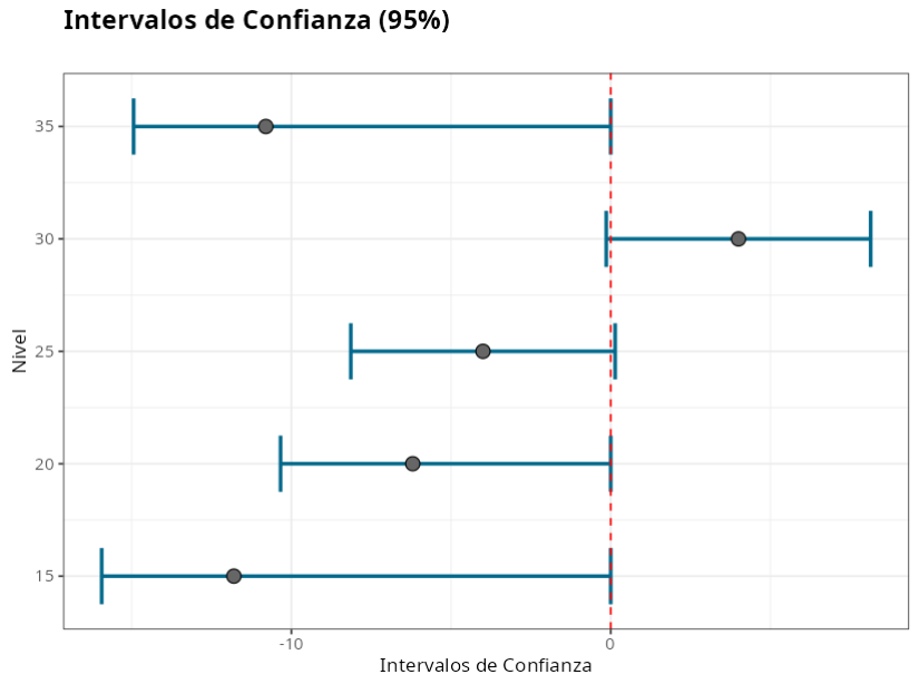 En el test HSU queremos que la mayor parte del intervalo sea positivo, por lo que el nivel 30 es el mejor si consideramos el test “la media más alta es la mejor”.