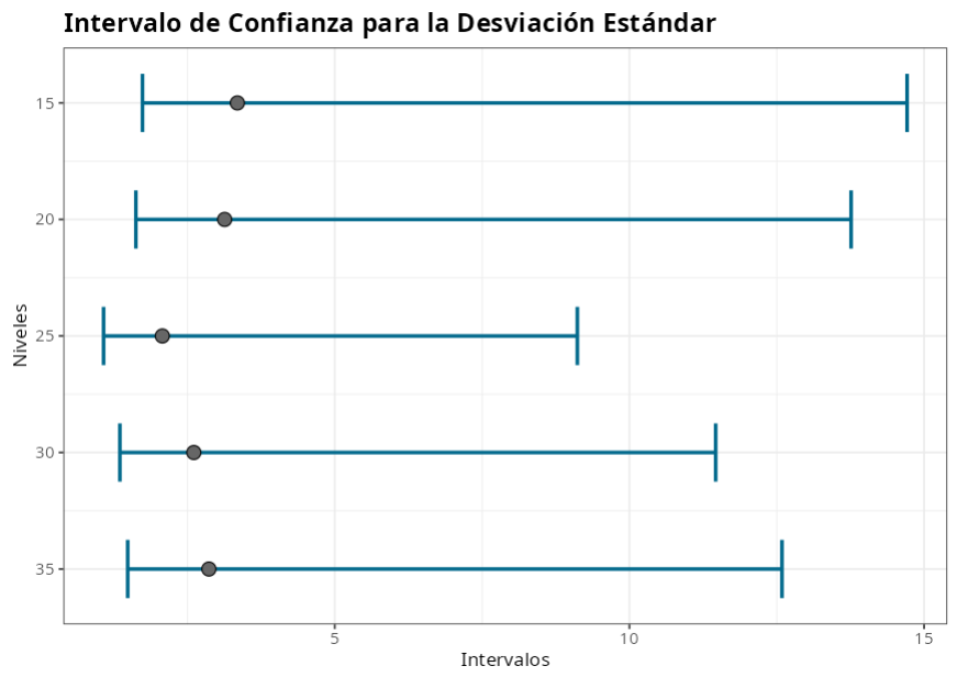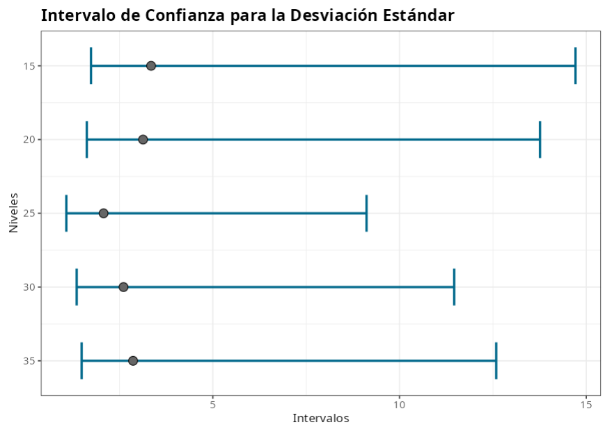 Estas pruebas evalúan la igualdad de varianza entre niveles de factores, utilizando las pruebas de Bartlet y Levene. Solo se pueden utilizar cuando existe un único factor. Esta herramienta también genera la gráfica de los intervalos de confianza para la desviación estándar.