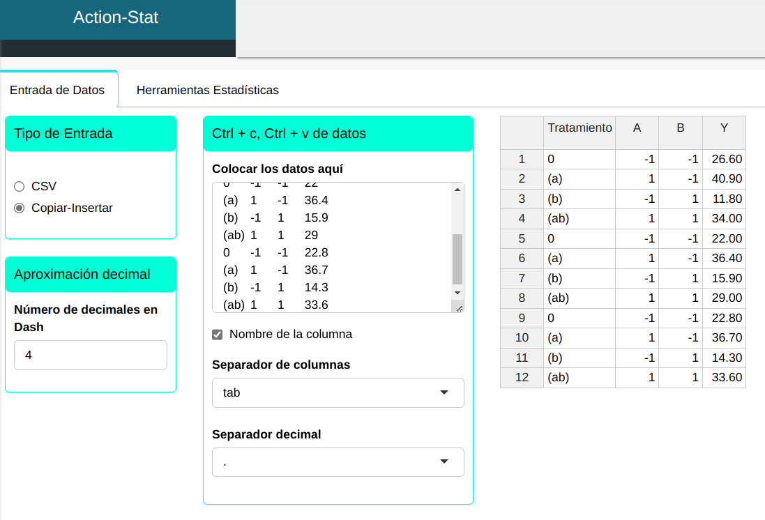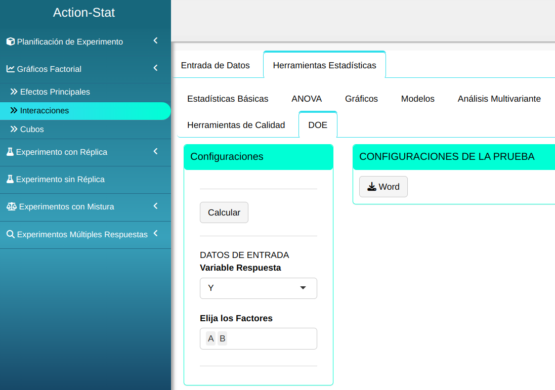 Realizaremos la gráfica de interacciones. Para ello accedemos a Herramientas Estadísticas y configurar conforme la figura abajo.