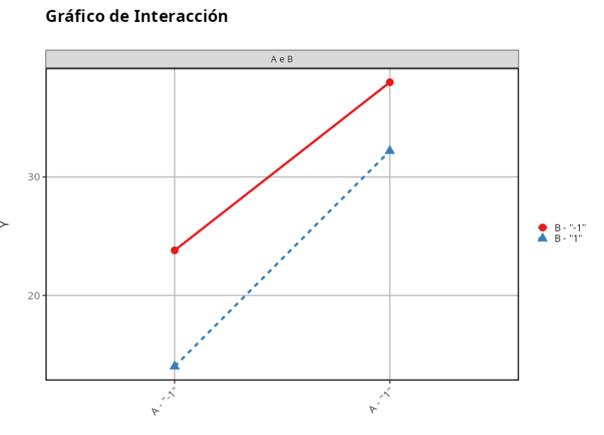 En la Figura 1. Vemos que no parece haber interacción entre los factores A y B, dado que las líneas son aproximadamente paralelas, es decir, cuando cambiamos el nivel del factor B, el comportamiento del factor A es similar en ambos niveles, indicando que no existe relación entre A y B.