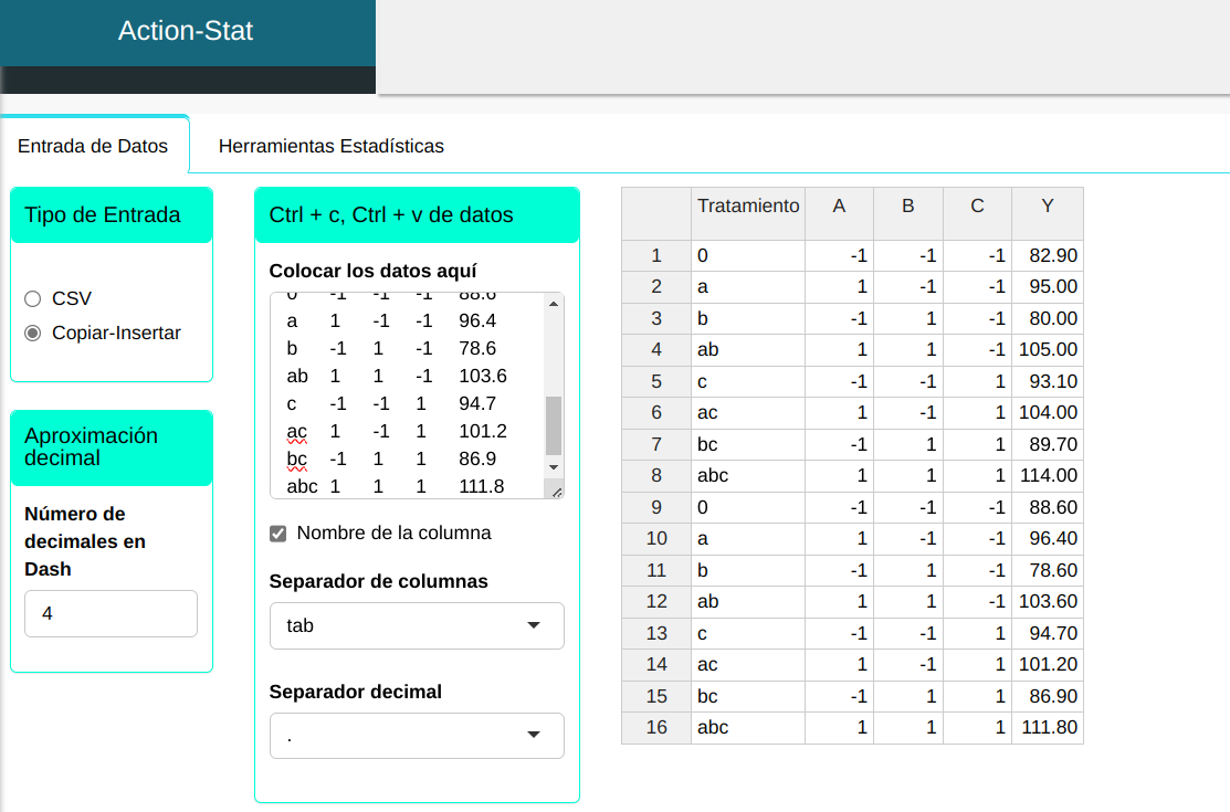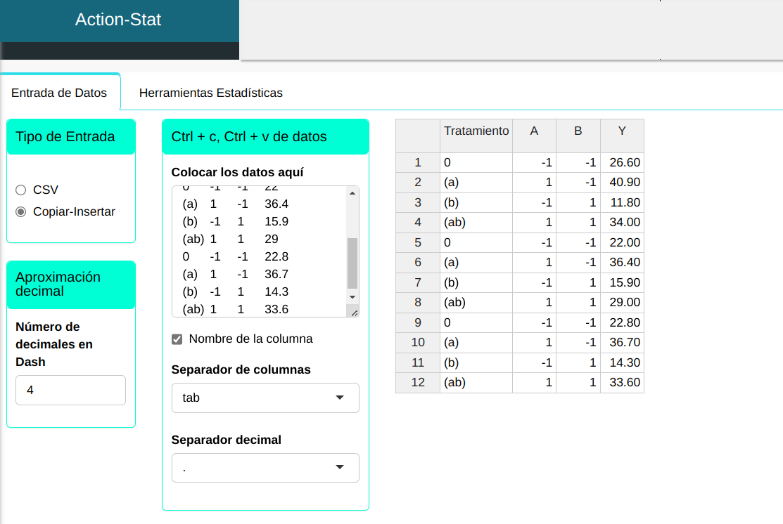 | Factores | A: Concentración de Reactivo (Níveis $V_{-1}$=10% e $V_{+1}$=20%) |