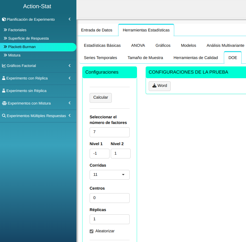Para llevar a cabo la planificación del experimento Plackett Burman, haremos los siguientes pasos: accede al sistema por Herramientas y configura conforme la figura de abajo.