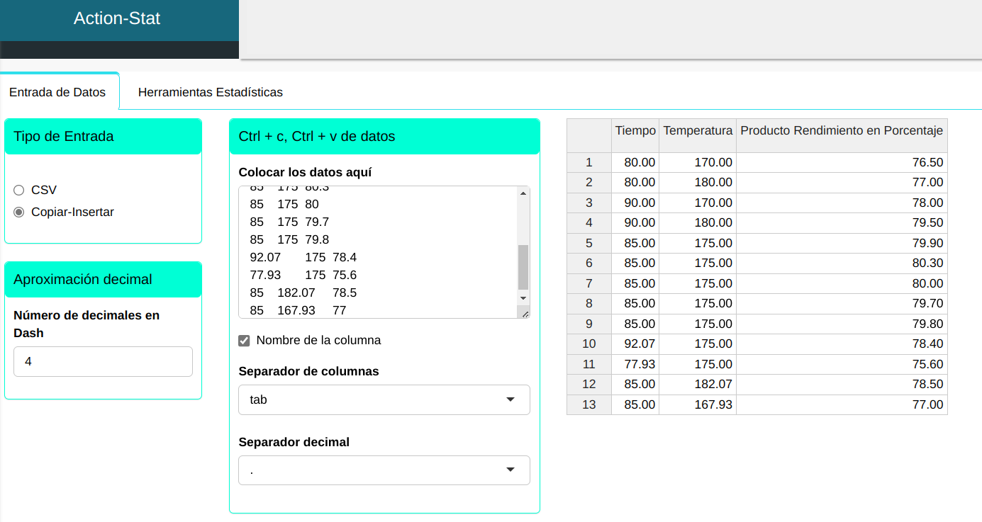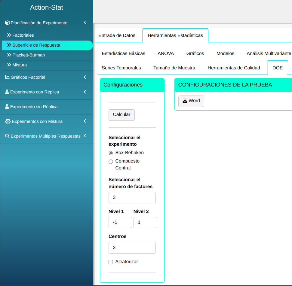 Para realizar la planificación del experimento, realizaremos la siguientes pasos: accede al sistema por Herramientas Estadísticas y configura conforme la figura de abajo.