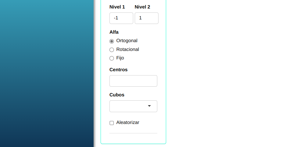 | Nivel | Temperatura | Agitación | Tarifa | $x_1$ | $x_2$ | $x_3$ |