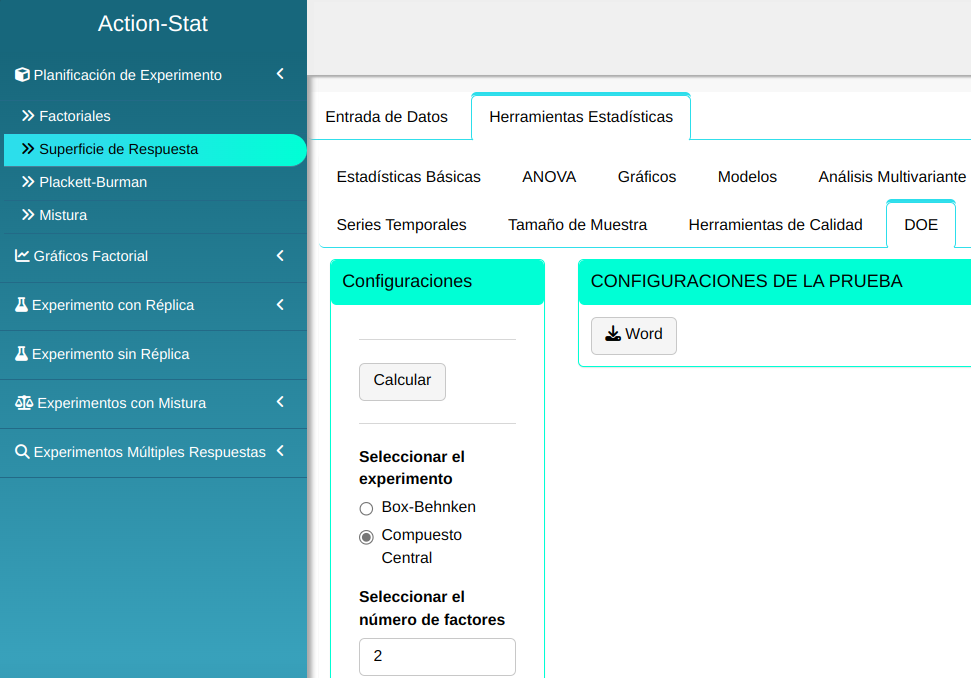 Para realizar la planificación del experimento, realizaremos la siguientes pasos: accede al sistema por Herramientas Estadísticas y configura conforme la figura de abajo.