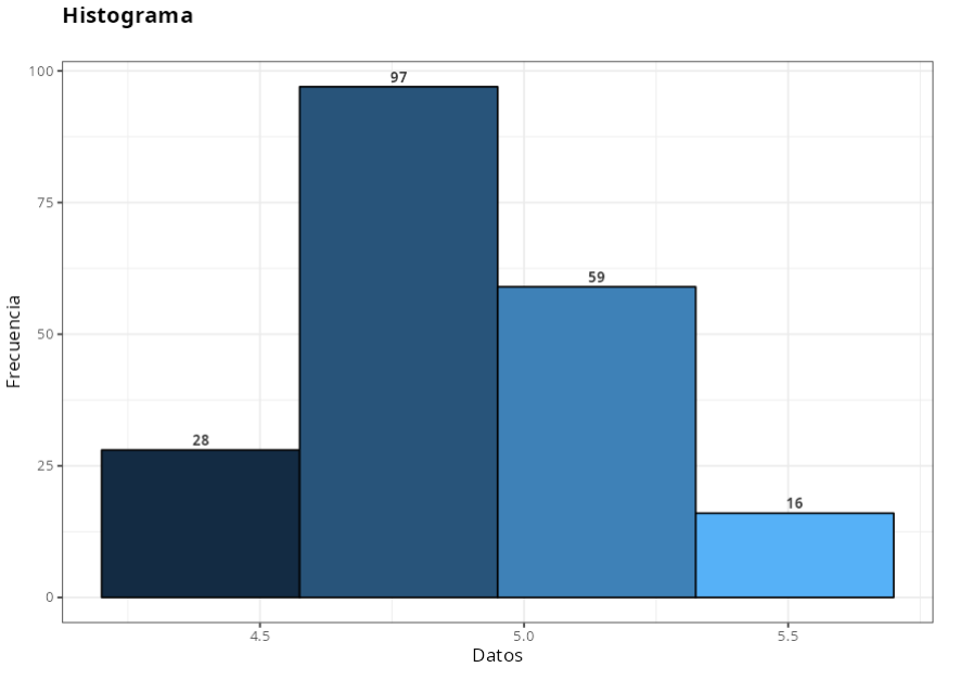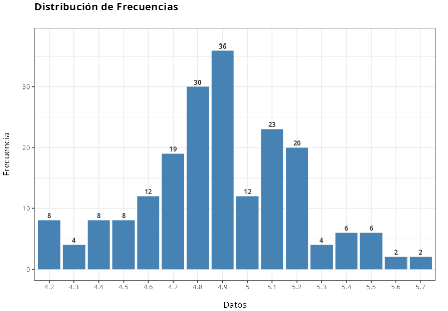 Con el resultado, obtenemos el recuento de datos. Tenga en cuenta que los datos son más concentrados entre los valores 4.6 y 5.2.