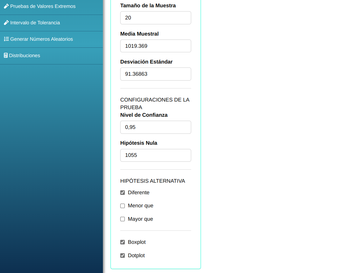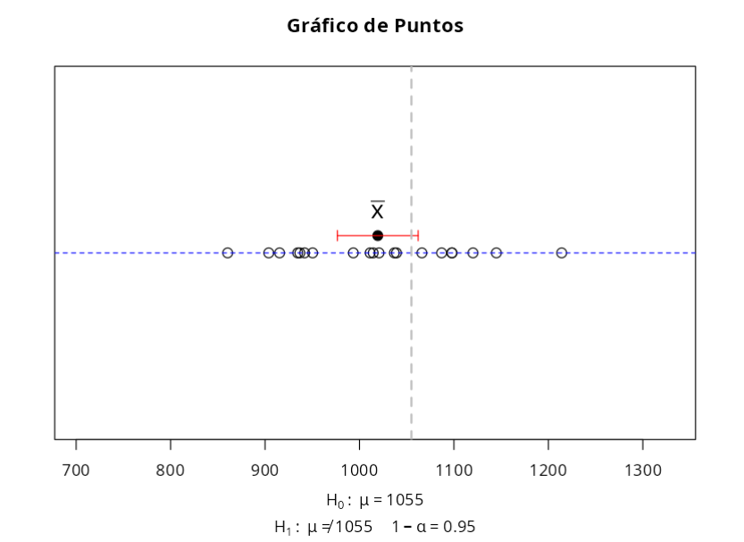 Un ingeniero de producción desea comprobar, con un nivel de significación de $\alpha=0.05$, si la altura media de una asta de tierra se aproxima al valor nominal de 1055 mm, a partir de una muestra de tamaño 20 con una media de 1019.369 y una desviación típica de 91.36863.