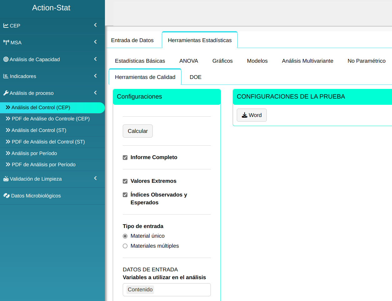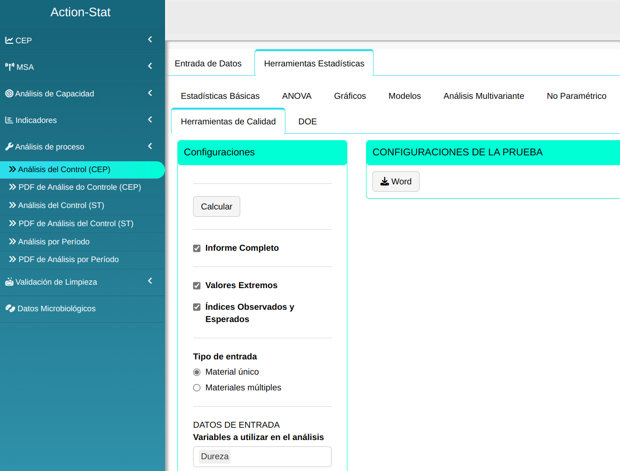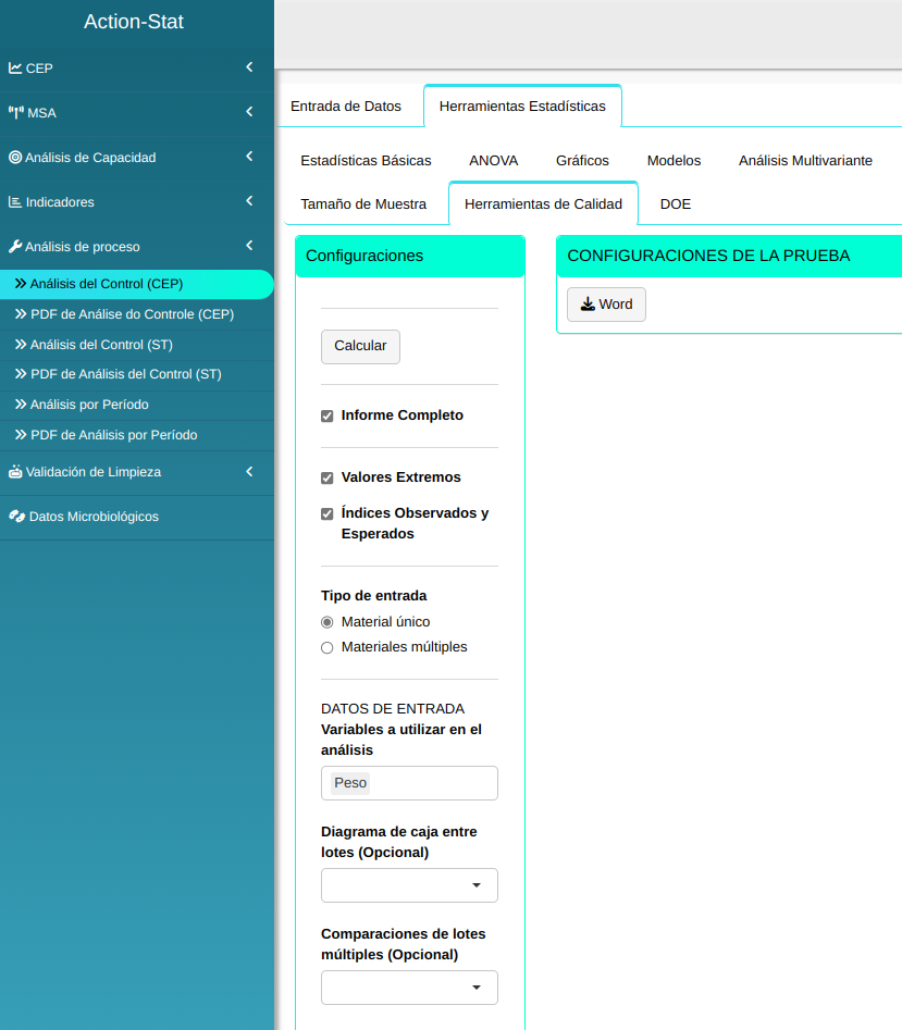 La orientación de ANVISA exige que las diversas industrias farmacéuticas realicen una evaluación estadística de los resultados del control del producto en proceso y del producto terminado. La metodología aquí presentada está bien fundamentada y sigue los requisitos de la Guía ANVISA (2012). Action Stat proporciona una herramienta estadística que permite la generación de informes completos de análisis de calidad de producto que contienen una metodología estadística que sigue el siguiente flujo: en primer lugar, se realiza un análisis exploratorio de los resultados con un resumen descriptivo y un gráfico BoxPlot. A continuación, se realiza una prueba de ajuste de distribución. Luego se evalúa la estabilidad del proceso utilizando cartas de control. A esto le sigue una evaluación de la capacidad y el rendimiento del proceso y, finalmente, una prueba de comparación de múltiples lotes.