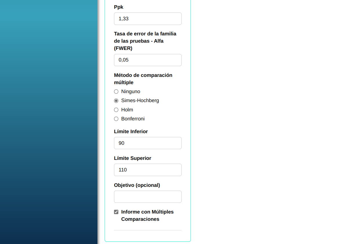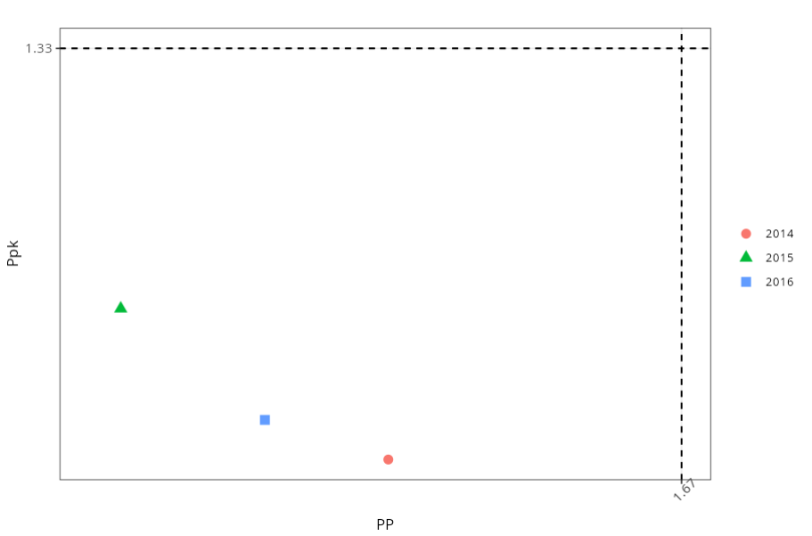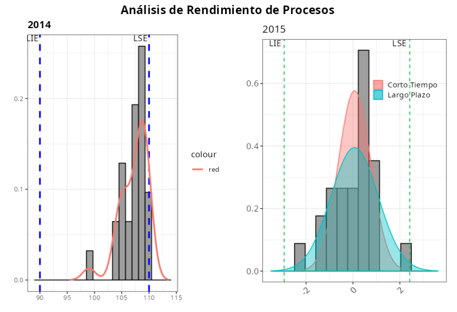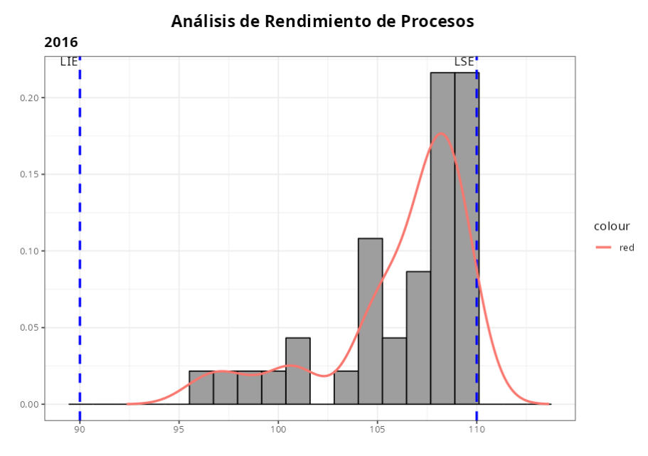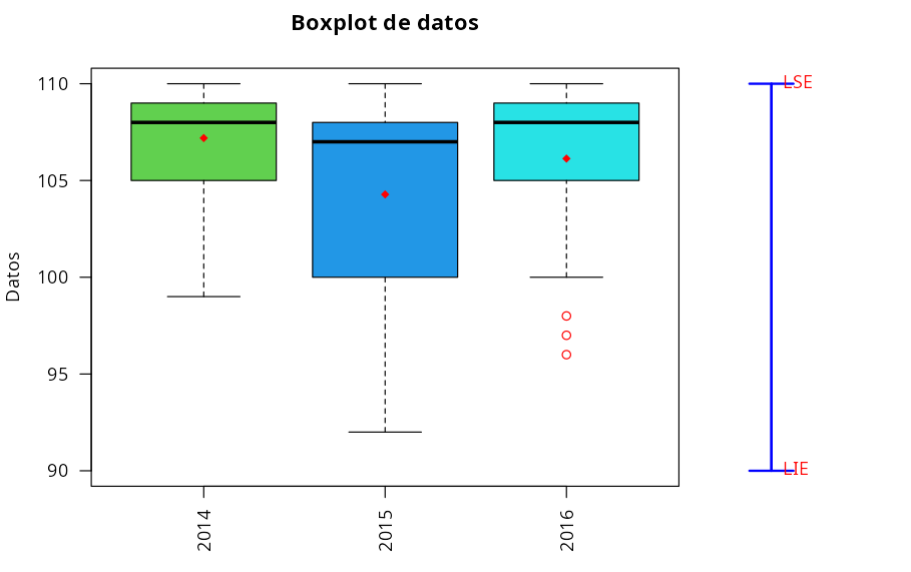 Un analista ha medido el teor de una substancia a lo largo de tres años: 2014, 2015 y 2016. Se definieron las especificaciones LIE = 90 y LSE = 110. El objetivo es generar un informe estadístico completo de análisis por período: