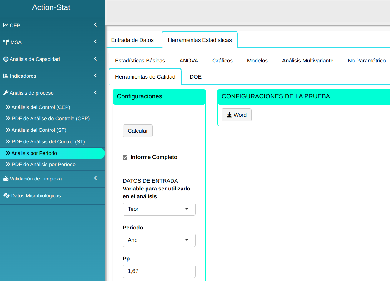El guía de ANVISA exige a las diversas industrias farmacéuticas que sea realizada una evaluación estadística de los resultados de control en proceso y de producto acabado. La metodología presentada aquí está bien fundamentada y sigue los requerimientos del Guía de ANVISA (2012). El Action Stat proporciona una herramienta estadística que permite generar informes completos de revisión de la calidad del producto conteniendo una metodología estadística que sigue el siguiente flujo: primeramente, se hace un análisis exploratorio de los resultados con un resumen descriptivo y un gráfico de BoxPlot. En secuencia se hace una prueba de ajuste de distribución. Después, se evalúa la estabilidad del proceso a través de gráficos de control. Se hace posteriormente una evaluación de la capacidad y performance del proceso y por fin, una prueba de comparación múltiple de lotes.