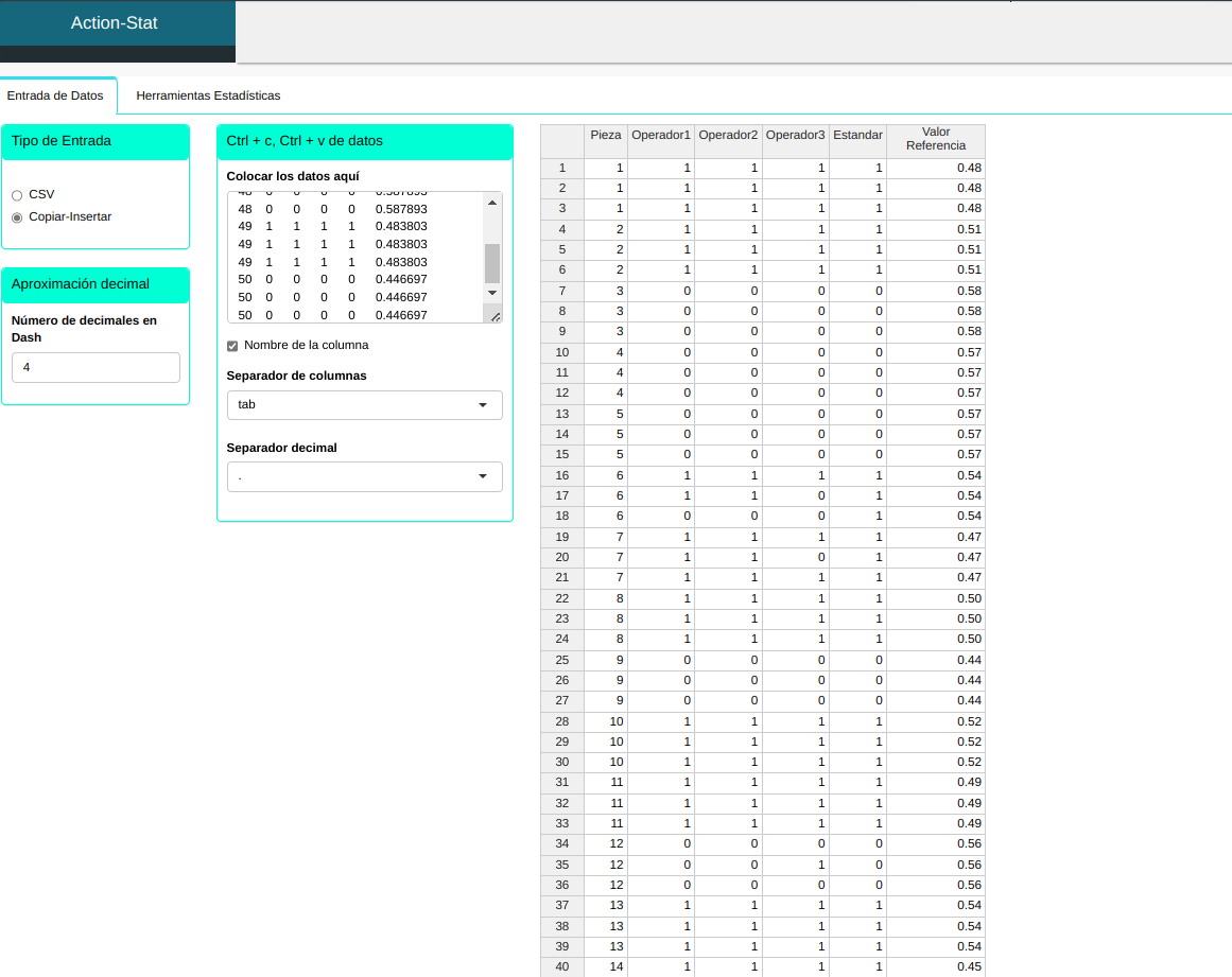 Consideremos un sistema de medición en el que se han seleccionado 50 piezas, 3 evaluadores con tres mediciones por pieza (cada evaluador). Los datos se muestran en el siguiente cuadro y en la Tabla A.1 del Apéndice A (Ejemplo dado en el Manual MSA 4ª Edición, página 127). Aquí consideramos 0 No Conforme y 1 Conforme, también consideramos LIE=0 y LSE=1.02.