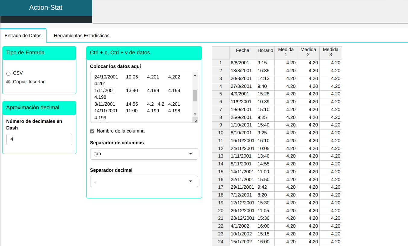 | Fecha | Horario | Medida 1 | Medida 2 | Medida 3 |
