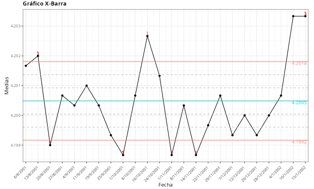 | 10/01/2001 | 4.199 | 2 de 3 puntos consecutivos mayores que 2 desviaciones estándar de la línea central |