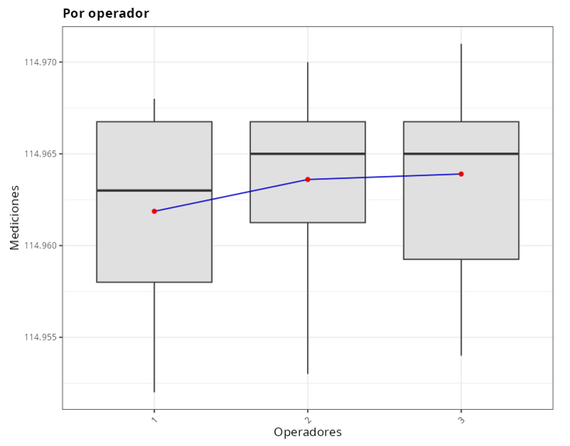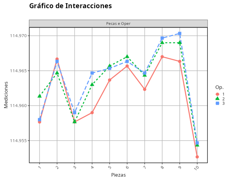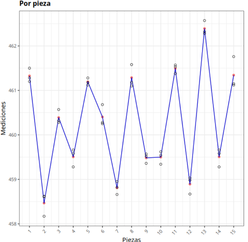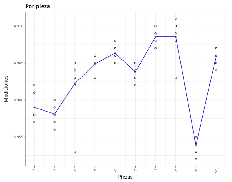 Consideremos un sistema de medición para medir el diámetro interior de un rodamiento. El ingeniero de calidad ha realizado un experimento con 10 piezas, 3 operarios y 3 repeticiones para cada operario y pieza. Los datos relativos a este experimento figuran en el siguiente cuadro.