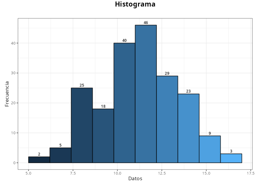 En el histograma vemos que la espesura de las arandelas se ajustan, aproximadamente, a una distribución normal, con las medidas concentradas próxima a la media (entre 9 y 11 mm).