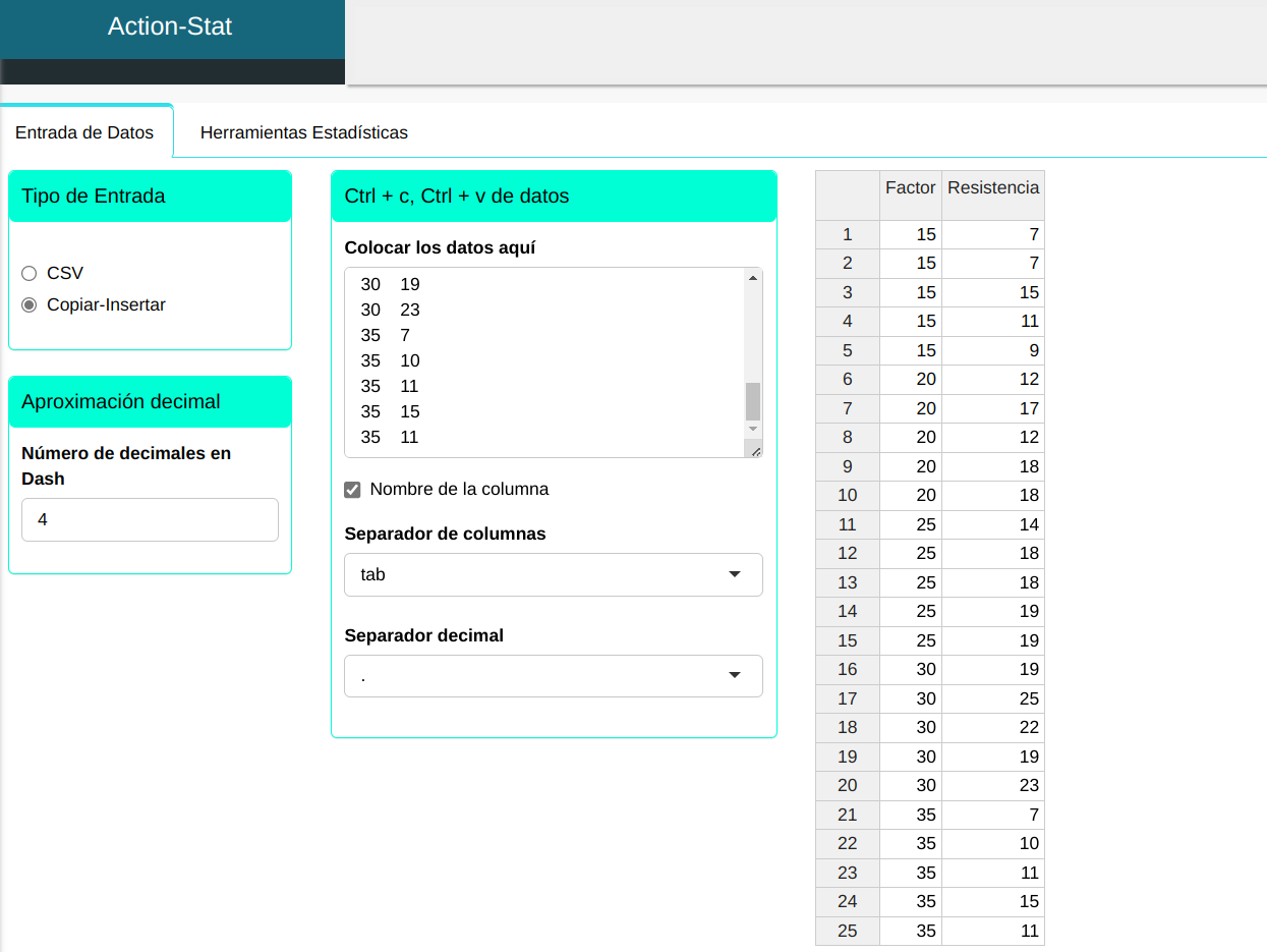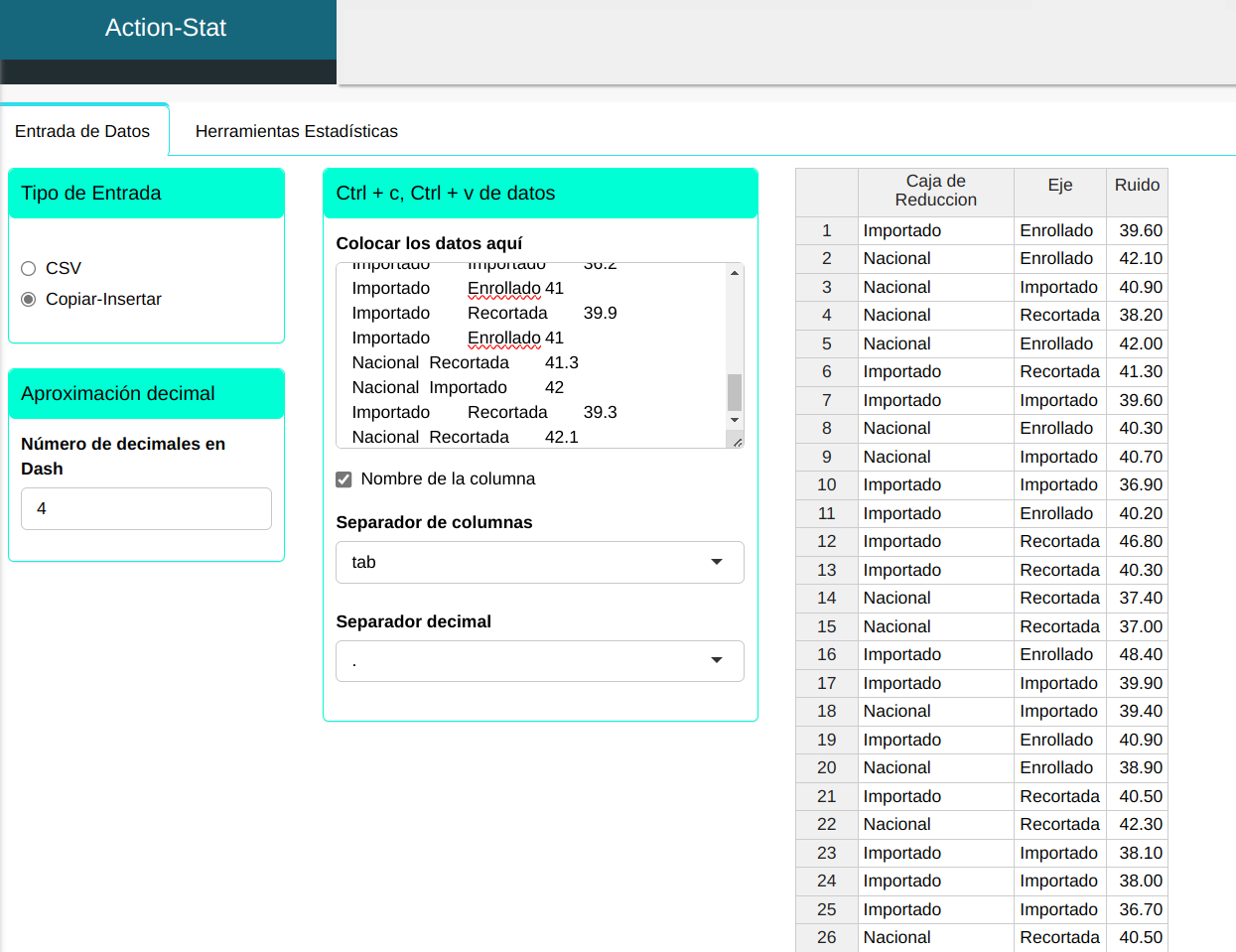 Consideremos un conjunto de datos con dos factores (caja de reducción y eje) y varios niveles, como se muestra en la siguiente tabla.