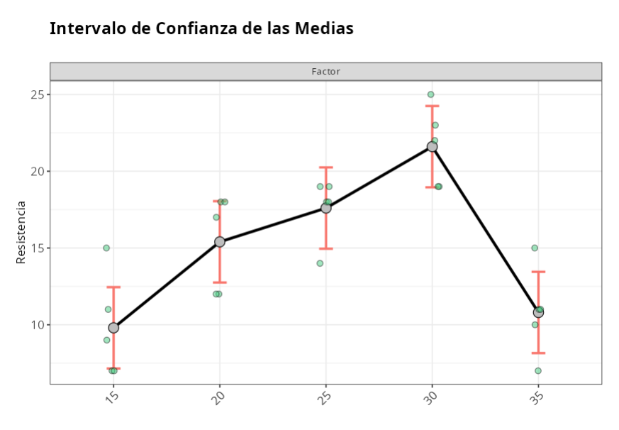 El gráfico y la tabla muestran la media de cada nivel y los respectivos intervalos de confianza. Se observa que los cinco factores difieren en cuanto a su resistencia, ya que el factor 30 presenta resultados relativamente más elevados que los demás.