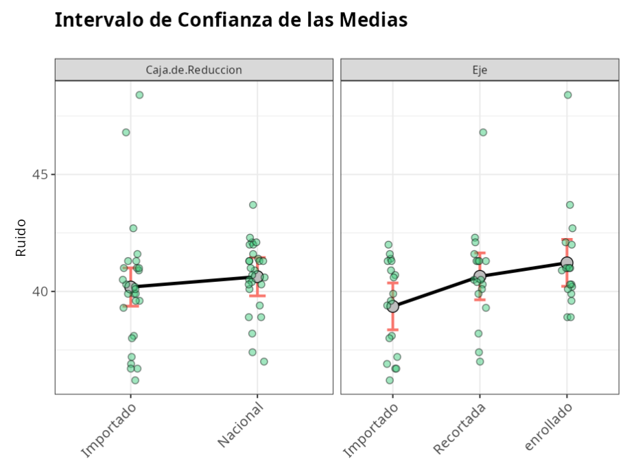 En el gráfico y también en la tabla, tenemos la media de cada nivel y los respectivos intervalos de confianza. Aquí observamos que independientemente de los factores y sus respectivos niveles, el ruido se comporta de forma muy similar, excepto cuando se considera el eje importado, donde el ruido, en promedio, disminuye.