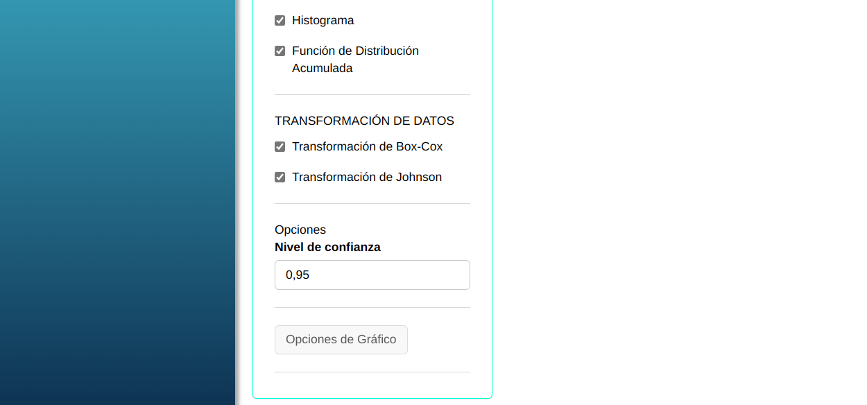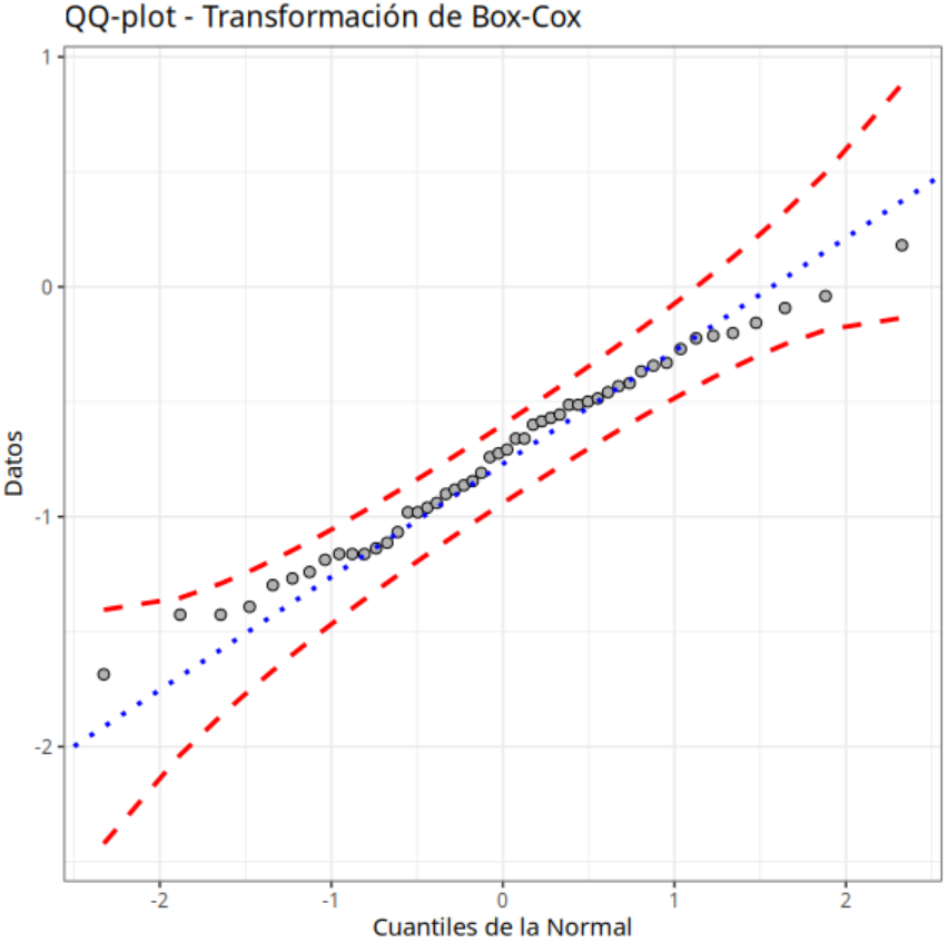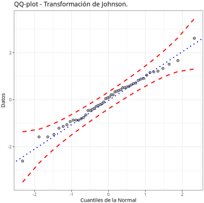 Los datos transformados mediante los métodos de Transformación de Box-Cox y Transformación de Johnson siguen una distribución normal. Este resultado puede confirmarse observando el P-valor asociado a la prueba de Anderson-Darling.