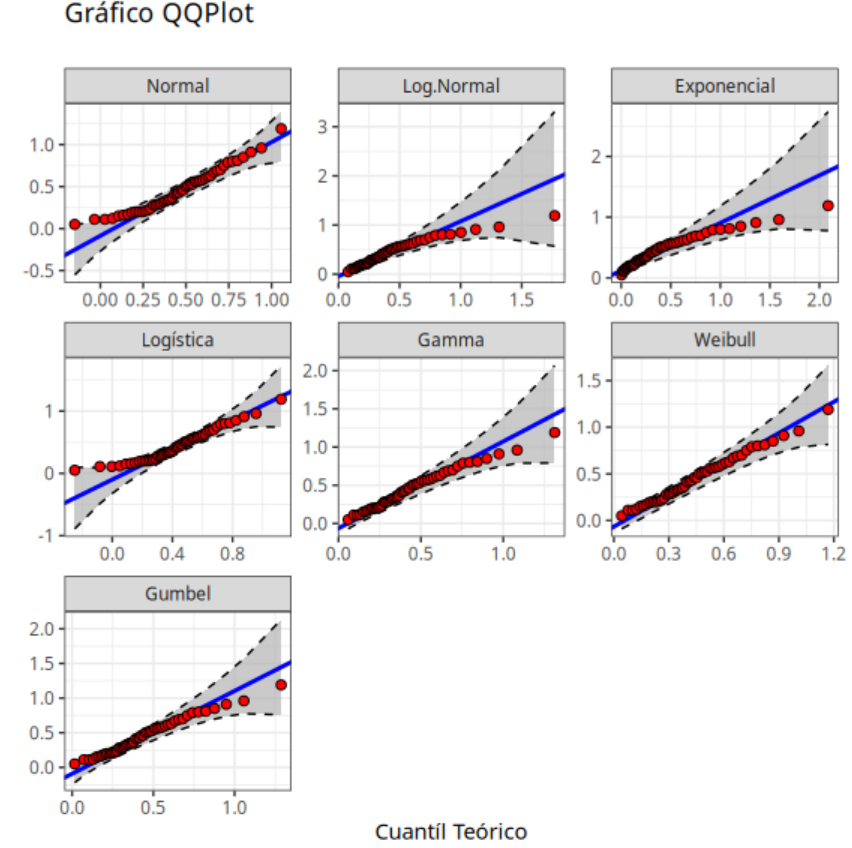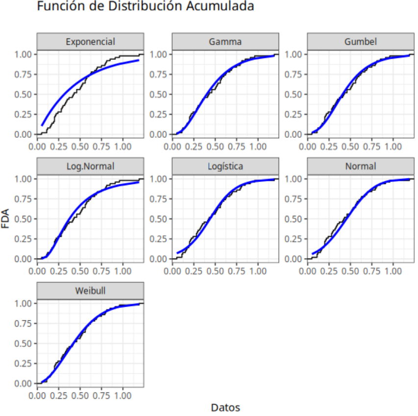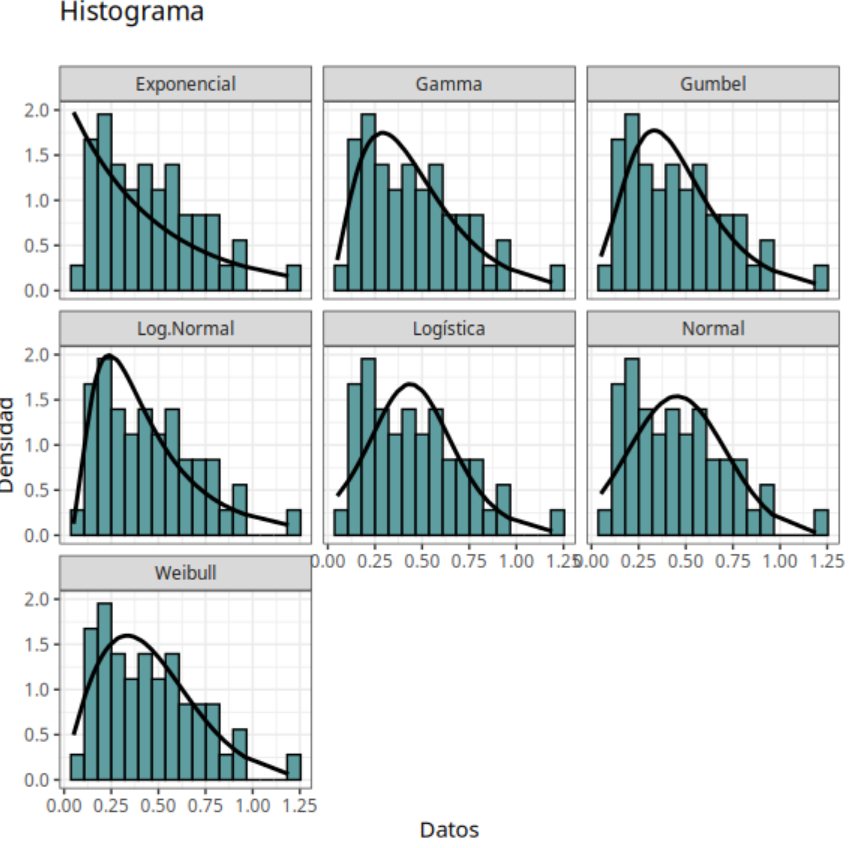 La tabla indica que los datos pueden ser mejor ajustados por todas las distribuciones excepto la distribución exponencial, lo que puede confirmarse cuando comparamos el P-valor de la prueba de Anderson-Darling con el nivel de significancia de 0.05.