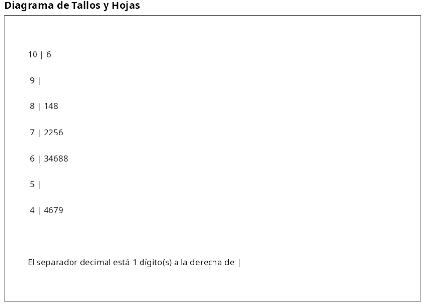 La primera línea del diagrama (10|6) significa que tenemos una observación 106. En la segunda línea, el número 9 sin número después de la barra diagonal (9| ) significa que en el conjunto de datos estudiado no tenemos ningún número entre 90 y 99.