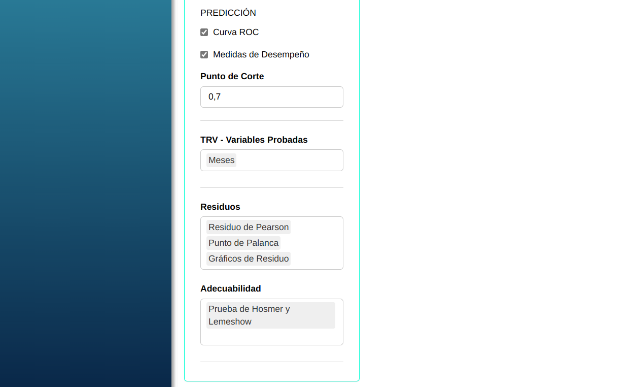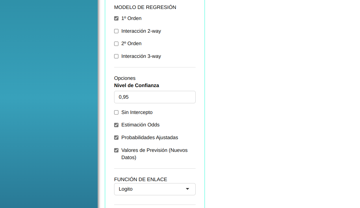Realizaremos el análisis “Modelo Binomial”, configurando conforme la figura abajo.