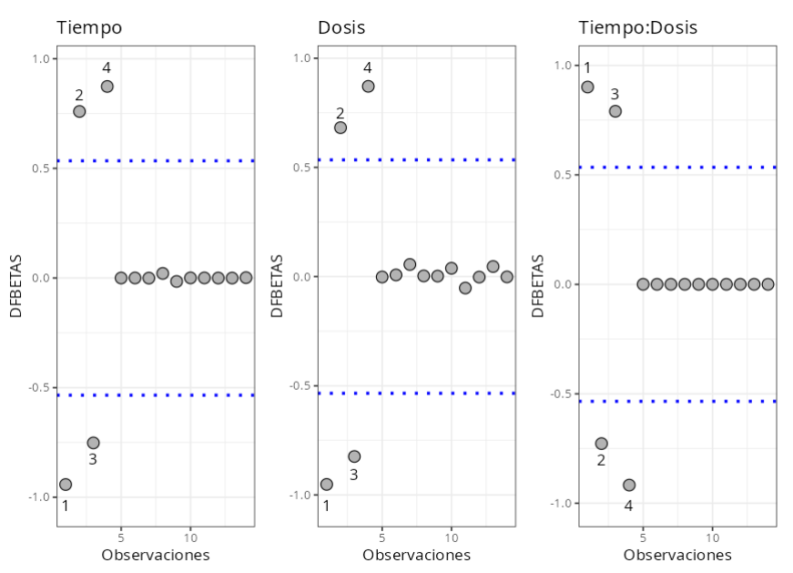 | N.Obs. | Tiempo | Dosis | Residuos | Residuos Studentizados | Residuos estandarizados | Leverage | DFITS | DFBETA | D-COOK |