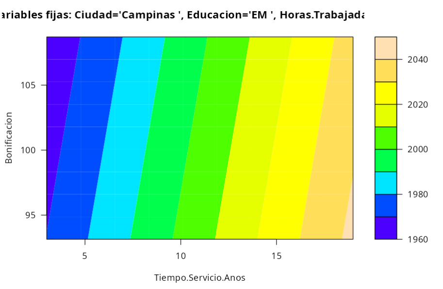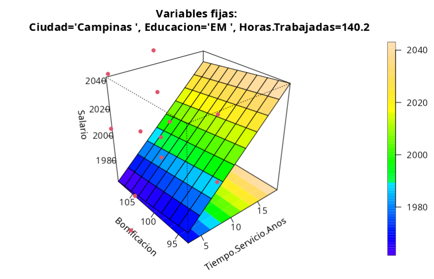 El salario neto mensual de los empleados de una universidad federal está relacionado linealmente con las variables ciudad donde trabaja (campus de Campinas y Curitiba), educación (Educación Superior Completa, Postgrado Concluido o Secundaria concluida), tiempo de servicio en la universidad, Bonificaciones totales en el mes y horas trabajadas en el mes. Se recopiló datos de 22 empleados. Estos datos pueden ser analizarse en el cuadro de abajo.